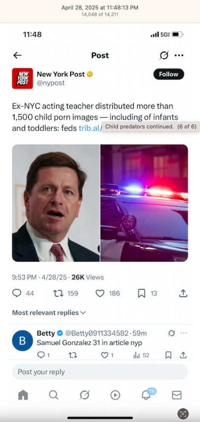 Screenshots above: The child predator posts elicited their usual influence on my page, which are the NY profiles shown under You Might Like. The profiles appearance are influenced and not normally what shows except after a post that hits their nerve or is spot on.
