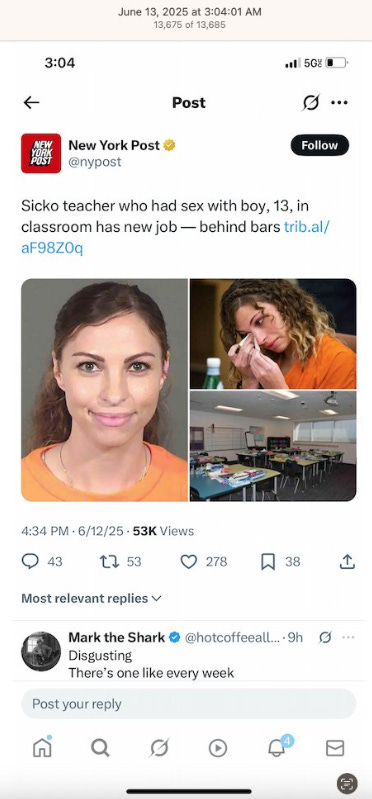 2wks ago, former Teacher of the Year in CA, had sexual relationships with two of her students, one aged 11 and the other 12 - Link to video.