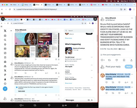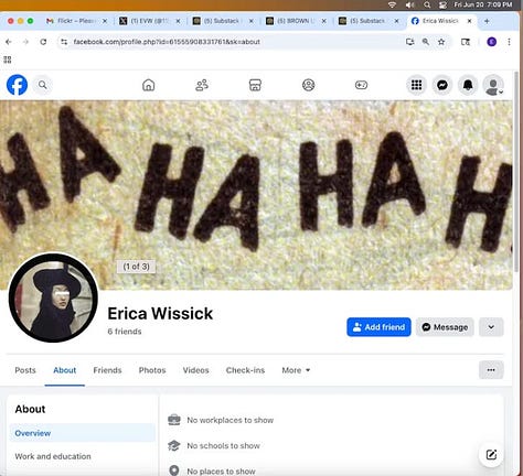 Screenshots above: First image is a comment to my X post by a fake profile that uses my Instagram photo and my name “Erica Erica” with the handle showing as, “@EricaWissickBLM”. The two screenshots after are the fake X account that’s since been blocked. Fourth image is another fake account of me, this one called “Erica Black is Back Wissick” with the handle, “Ericablack2024”. Fifth screenshot is a fake Facebook account followed by another fake X account of me that left a comment to a November 2024 X post. Always there’s reference to race, black/BLM, and it’s always weaponized.
