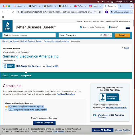 Other BBB complaints examples of defective and damaged deliveries of Apple and Samsung devices that exploded, caused fires, burned the skin - Link to post (towards bottom). Link to Apple’s BBB and Link to Samsung’s BBB.