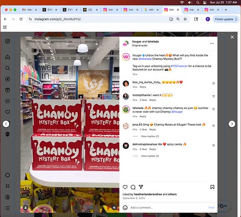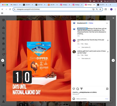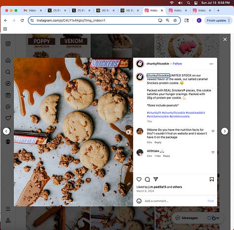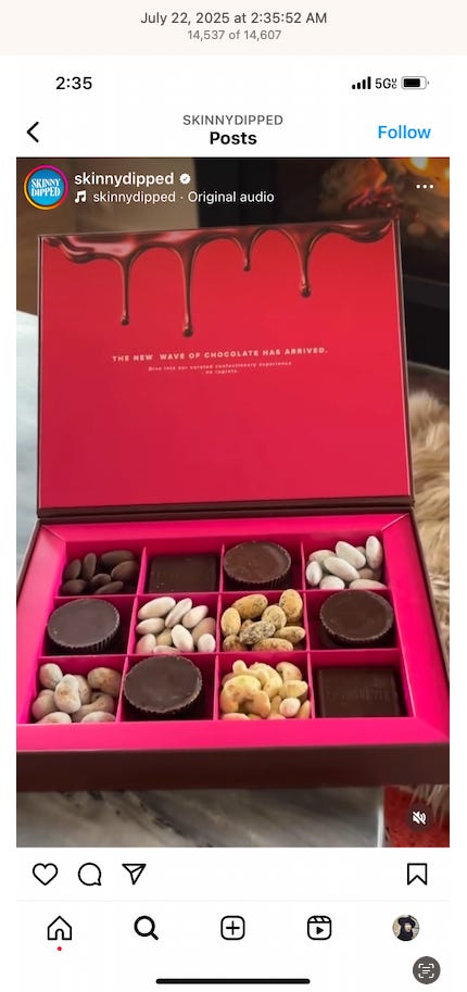 Screenshots above: ChocBox. LiquidIV. Drip. Owala. Miami Dade Community College. Nutpods, “Dripping”. Banza. Magnum Ice Cream. Recess. Reeses Peanut Butter Bars.