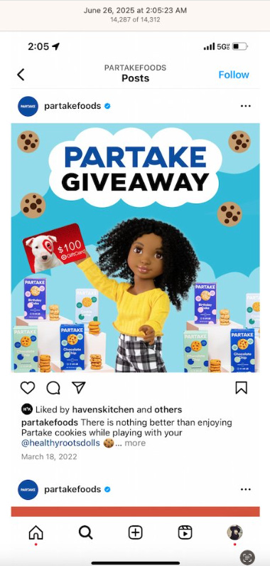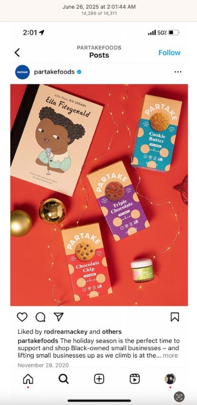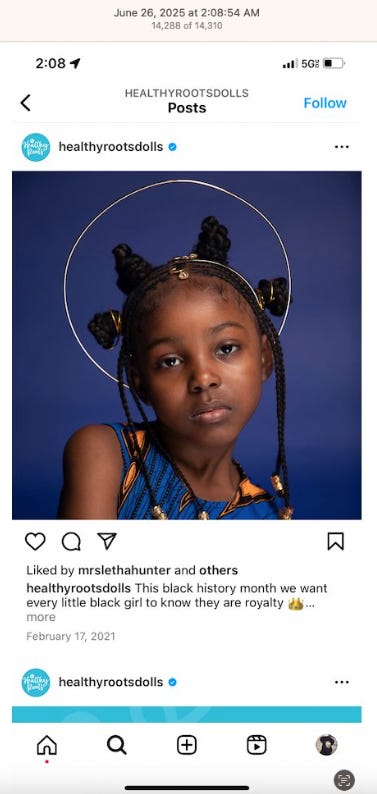 Screenshots above: Here's an example of the parasitic relationship of two criminally influenced brands, Partake and Healthy Roots Dolls. Partake's founder is POC female (she looks to be Asian/mixed), and based from Partake's Instagram, her partner is black. They have a kid. The criminals want everyone to have "blackness", so they're inclined to make her successful. Partake endorses many brands, "Buy Black", and social justice/identity politics on its Instagram page. Healthy Roots Dolls has multiple posts on “crowns”, “royalty”, “princess.”Teaching black kids that they're superior to everyone else.
