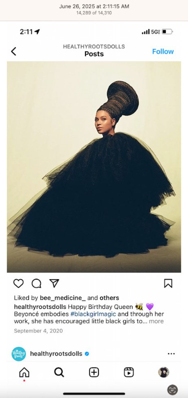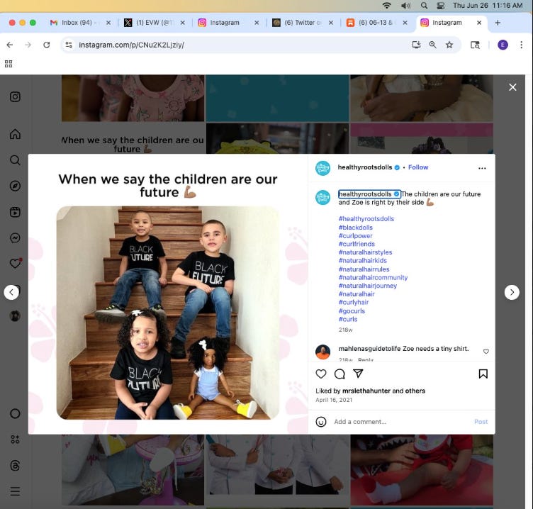 Screenshots above: Example's of "firsts" on Healthy Roots Dolls's Instagram. The criminals’ obsession with firsts contradicts their See-To-Be. All the firsts were just that, firsts. There was no one for them to See-To-Be, proving that See-To-Be is false, and that so long as a person can see it in their mind that should be enough to go for it.