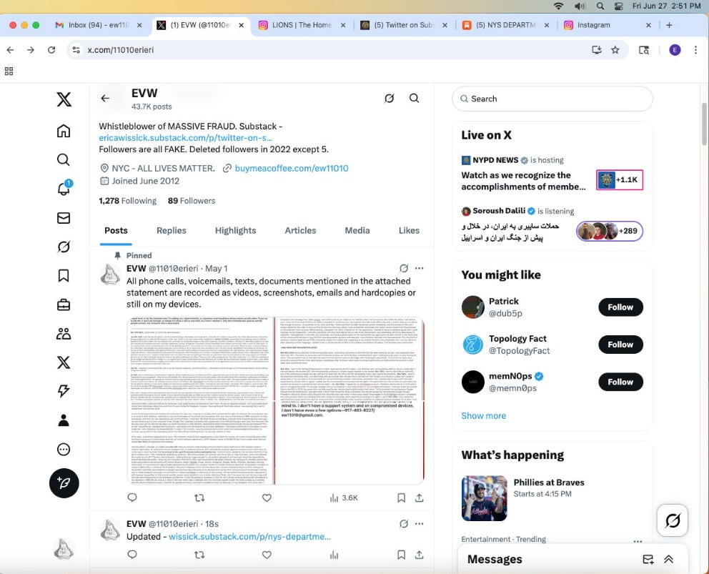 Why do they keep doxxing me, photoshopping things I would never say in a manner that is out of character for me? Intimidation, character defamation, provoke suicidal ideations (which is impossible lol), have people I know turn against me, get people I know fired (again)—people’s emails that I’ve never posted online (except the landlord’s lawyer’s) nor do I have myself (my friend’s daughter’s, his job’s—I did not know those emails); cause whatever havoc and chaos they can. It's their criminal model deployed by their number one tactic, impersonating. Incidentally, I was going to the police precinct today to get the last PR number on June 20th, and will file another one, making it my 7th police report! All since 2022!