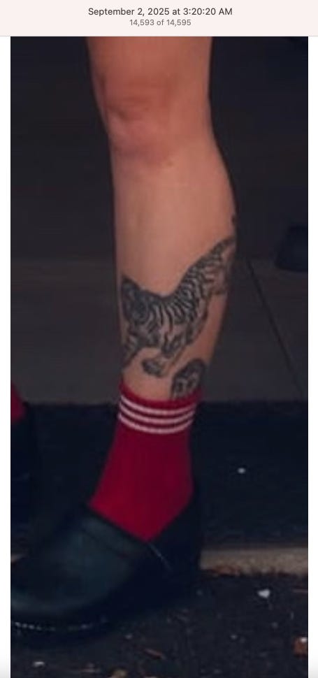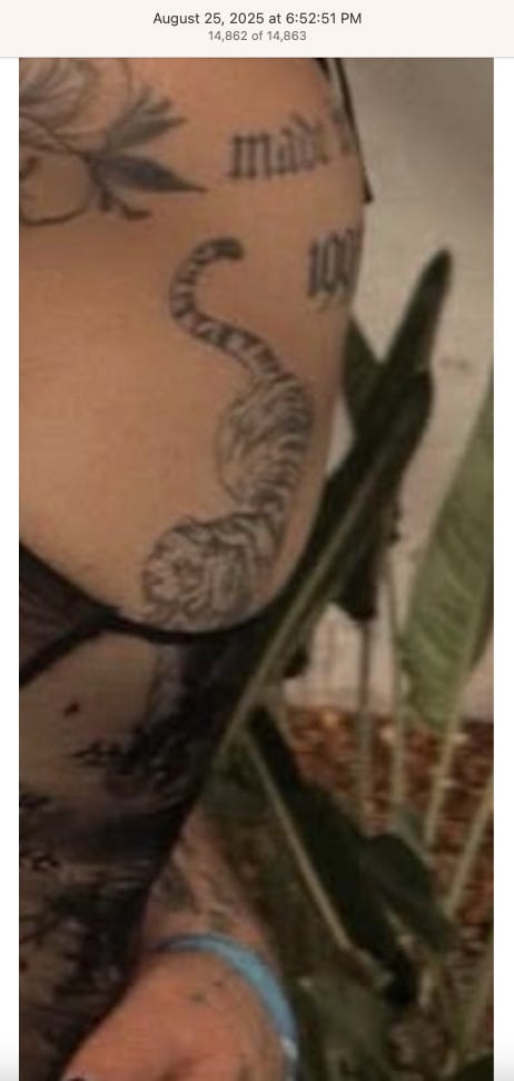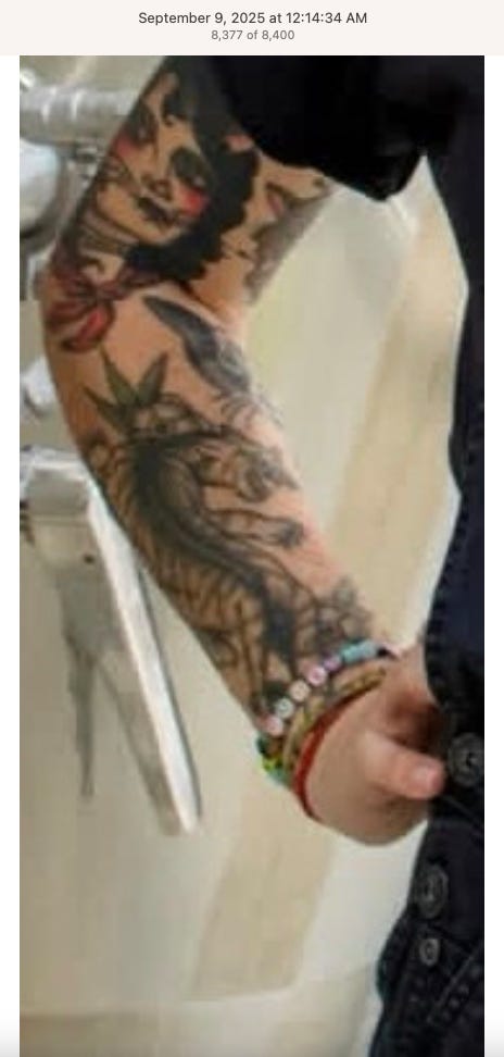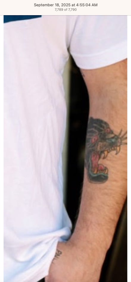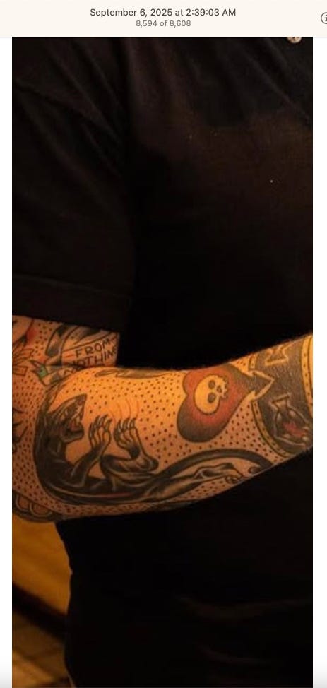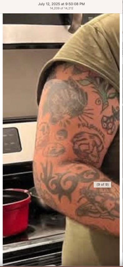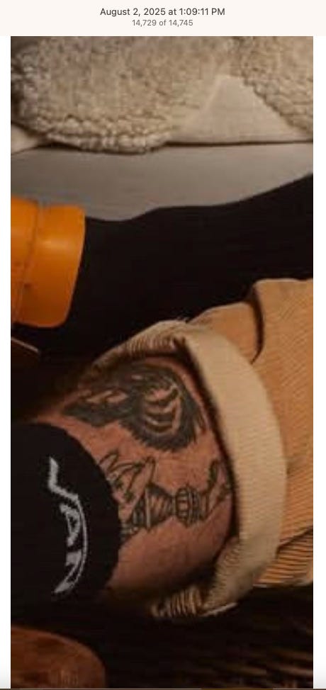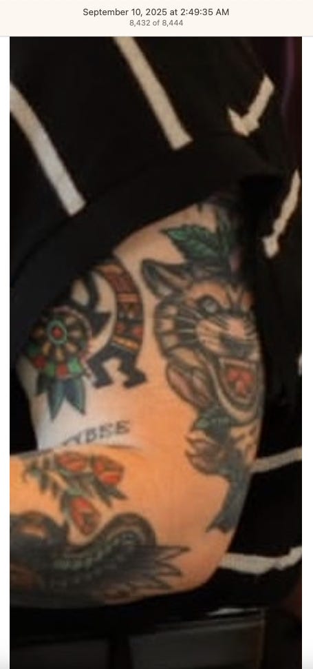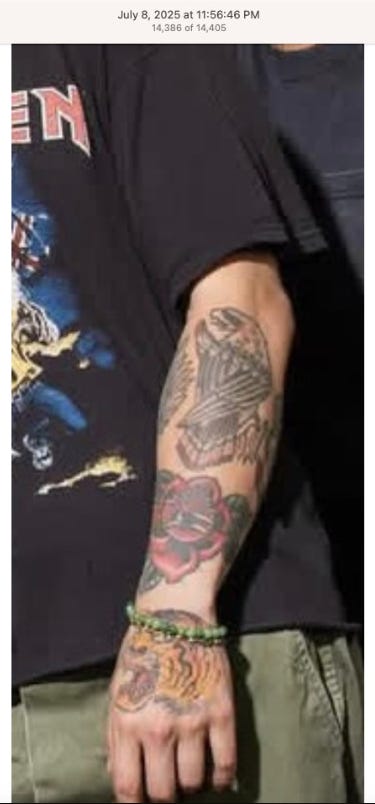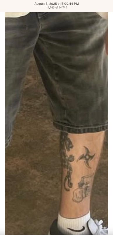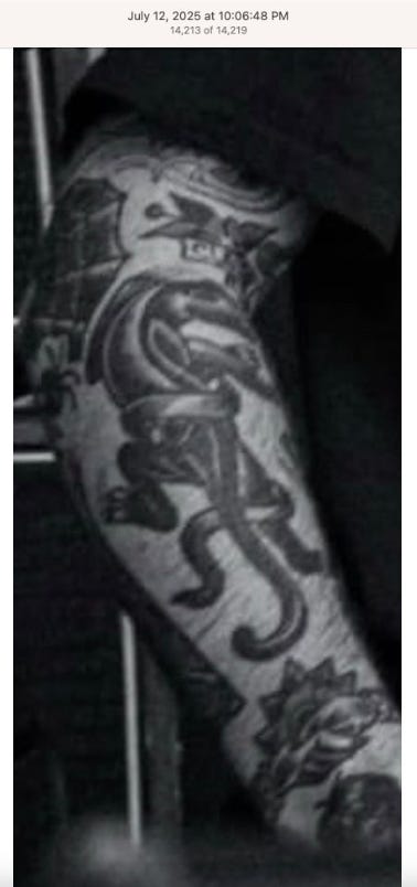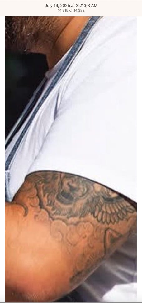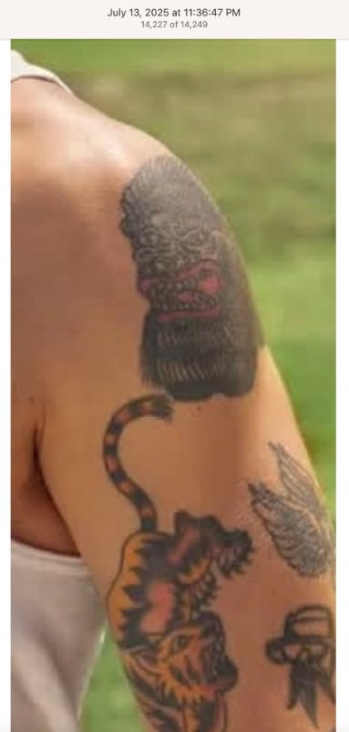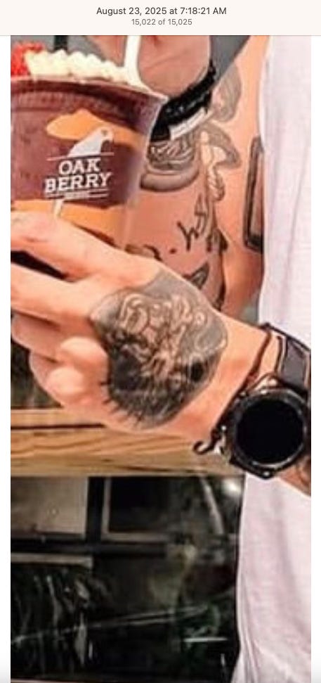 Screenshots above: Lion and tiger tattoos on the hand: GLD. The sneaker entrepreneur who was murdered outside his SoHo store in June 2024. Anker. Last Crumb cookies. Hedley and Bennett (rose). Uncle Paulie. Bawi. Buddies. News & Coffee.