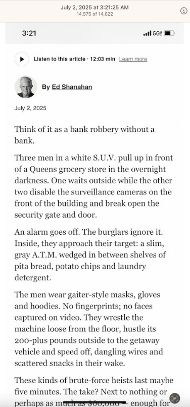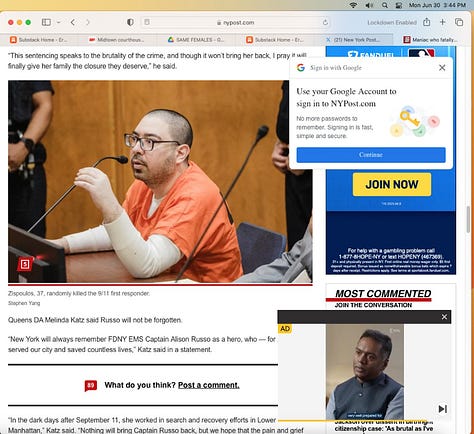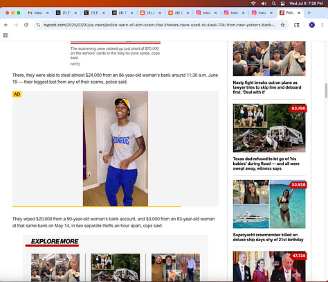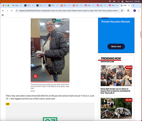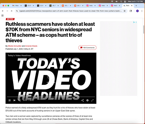 Screenshots above: Most recent scams targeting the elderly in the Upper East Side when they withdraw money from ATM’s. Last screenshot shows ad; all ads online and on Roku are one dominant representation. Link to New York Post article. The fourth screenshot of highlighted text is of an elderly who said, "The bank would not do anything and would not look at the tape of give me back the money." Probably because criminals work at the bank.