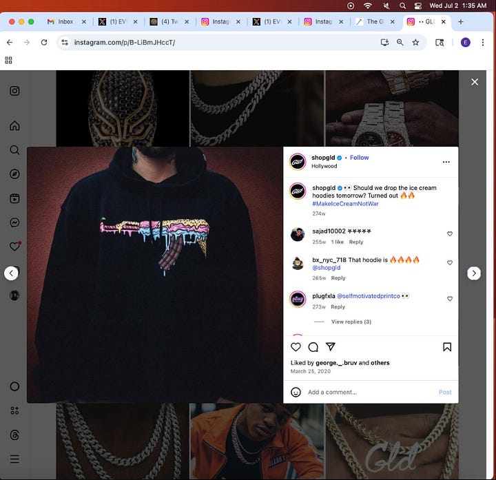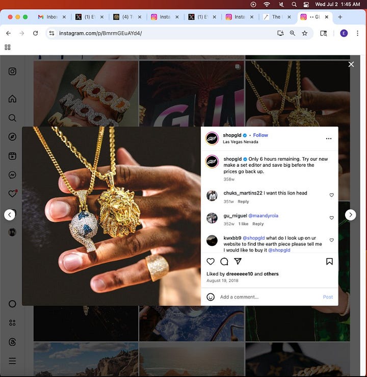 Screenshot above: GLD (a jewelry store in Astoria that frequently airs ads on Roku). Lion tattoo, drips, lion medallion, and what looks to be a tattoo of Karl Marx, the communist.
