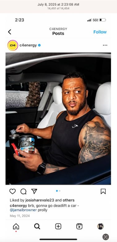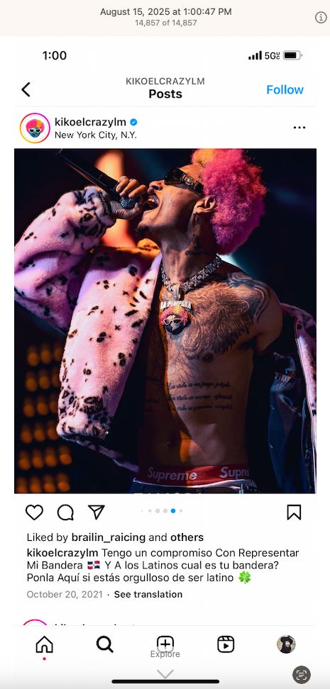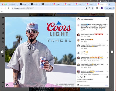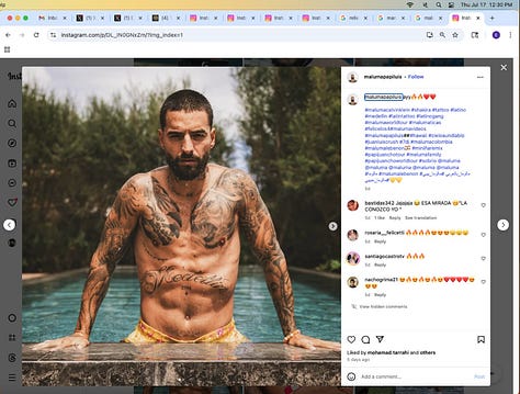 Screenshots above: Musicians and athletes with lion/big cat tattoos. Fourth is a Colombian celebrity musician who wears fur coats at his concerts, a recent trend with pop stars, and has luxury brand product placements on his Instagram that’s criminally influenced, I’m sure.