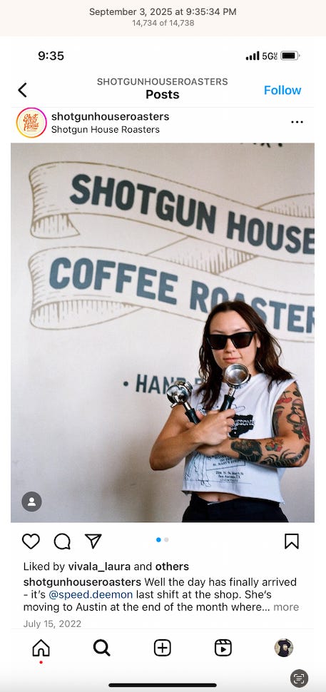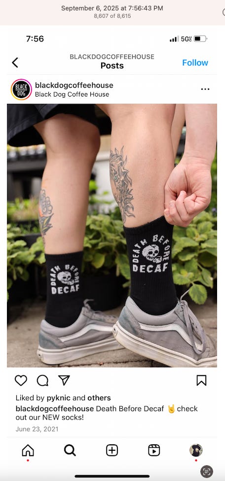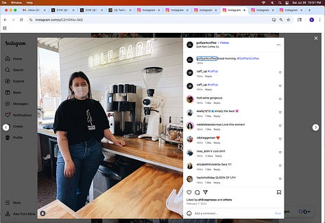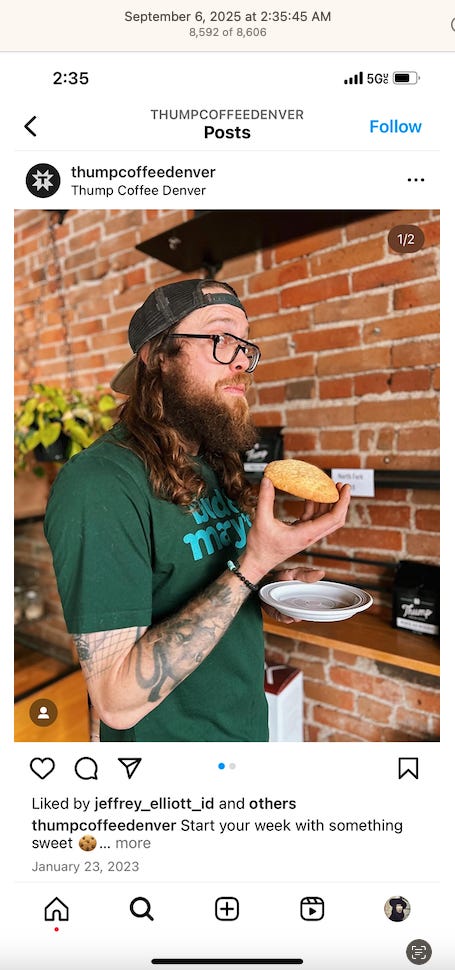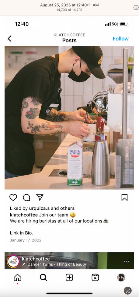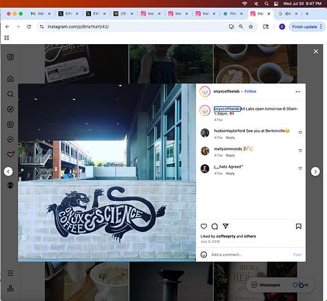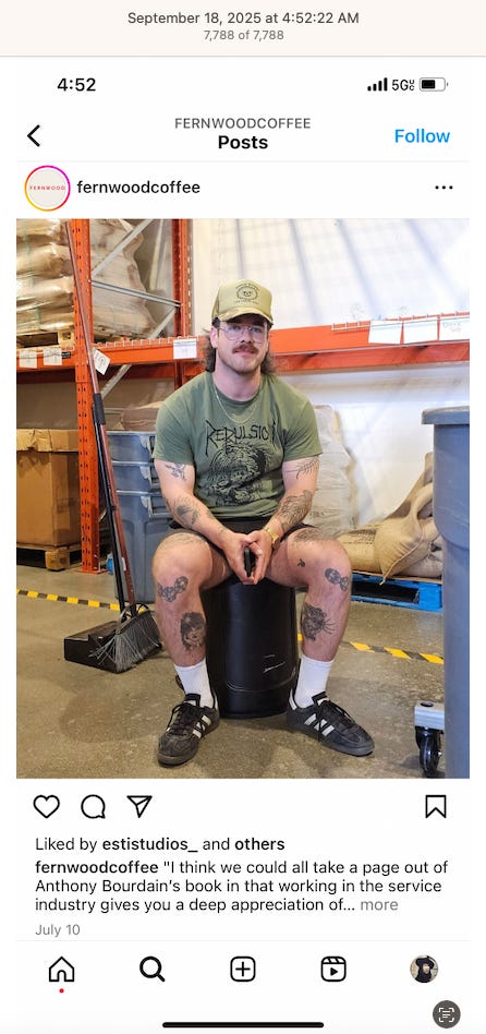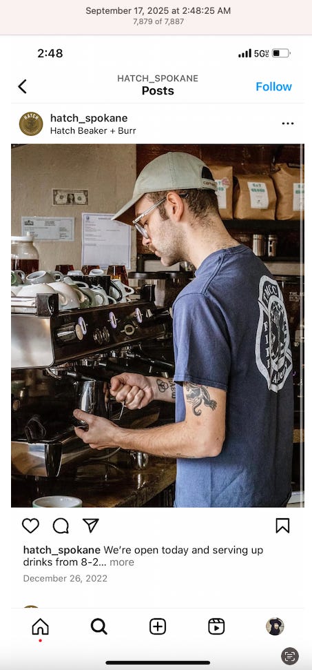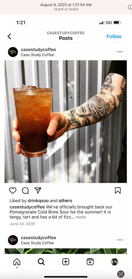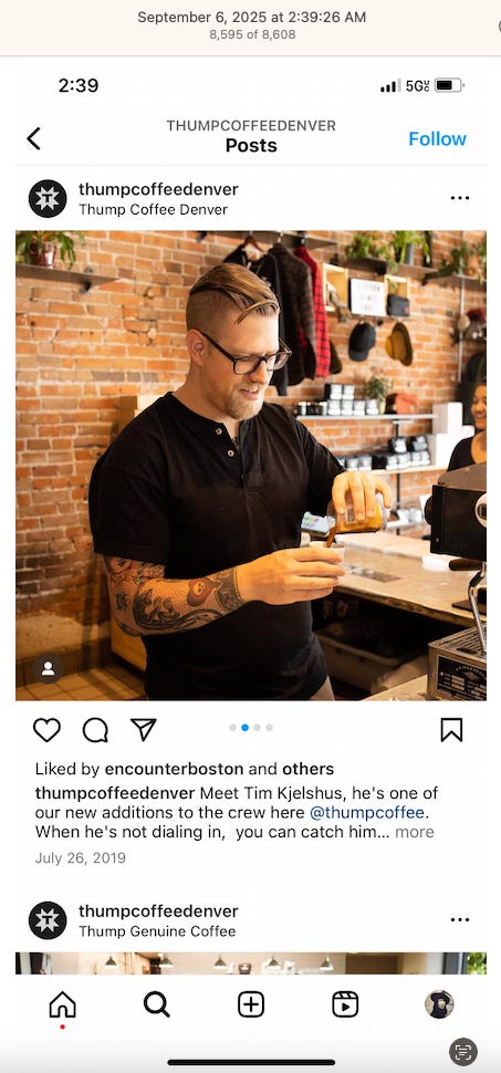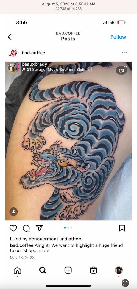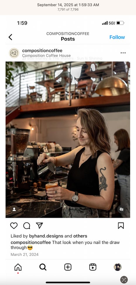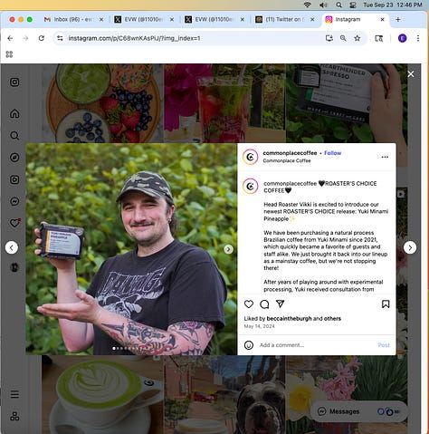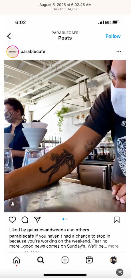 Screenshots above: Minnow's Instagram had another image of the person that gave his handle. That's how I landed on his Instagram for a better view of the tattoo that looks to be of the same model panther. Thump Coffee. Parsons Chicken. Common Place Coffee. Odd Luck Coffee.