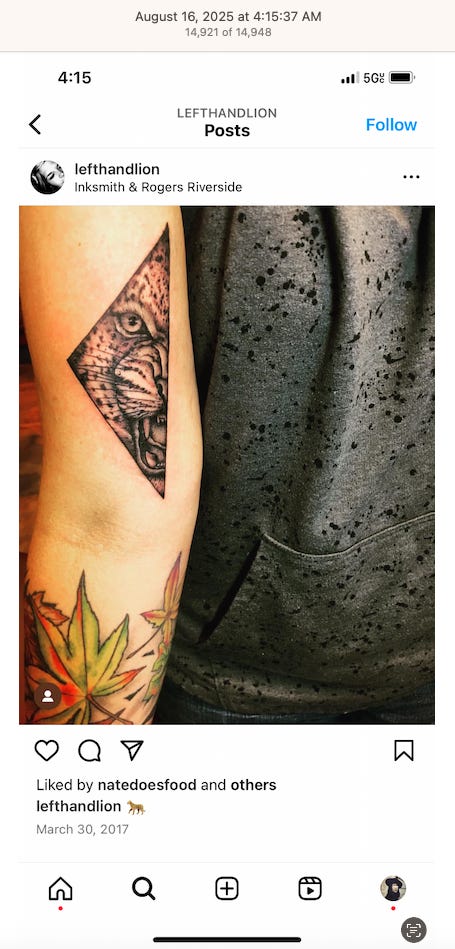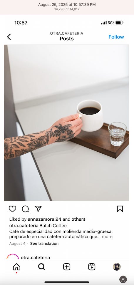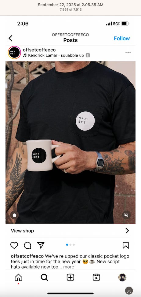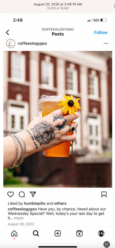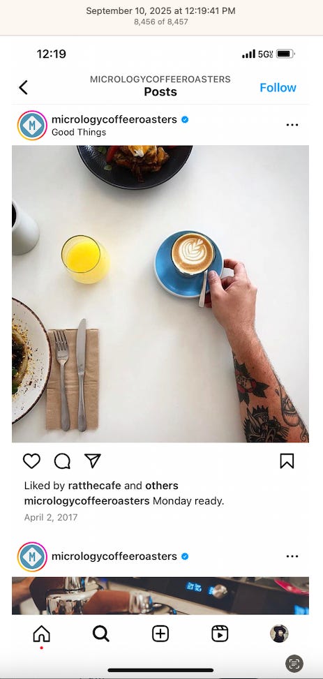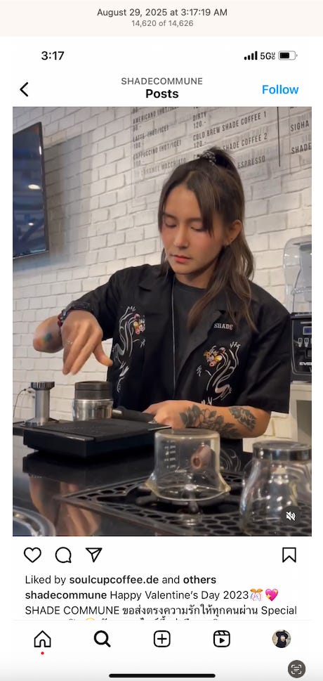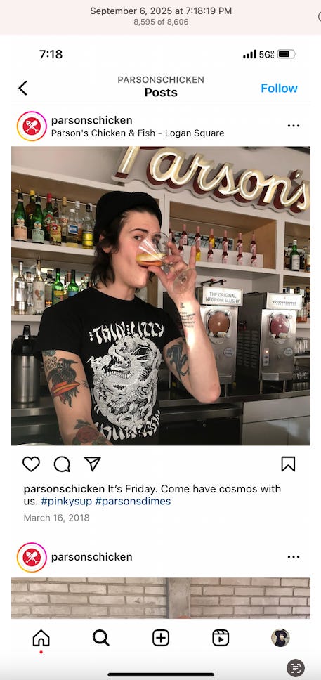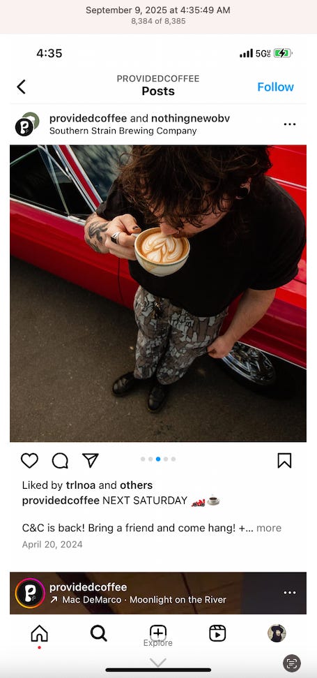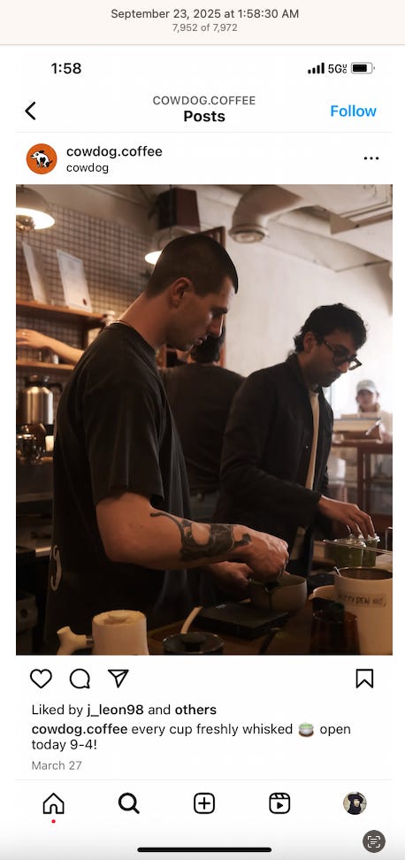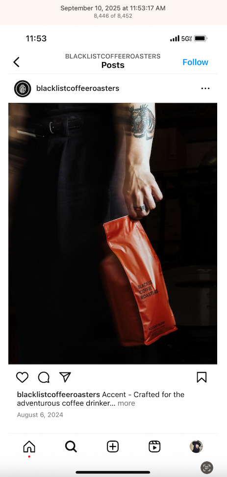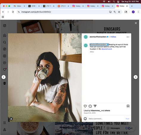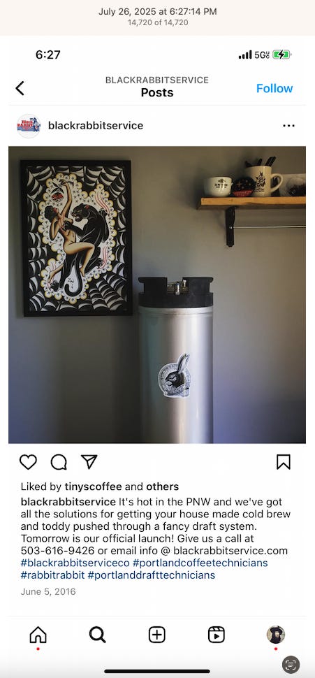 Screenshots above: Minnow's Instagram had another image of the person that gave his handle. That's how I landed on his Instagram for a better view of the tattoo that looks to be of the same model panther. Thump Coffee. Parsons Chicken. Common Place Coffee. Odd Luck Coffee.