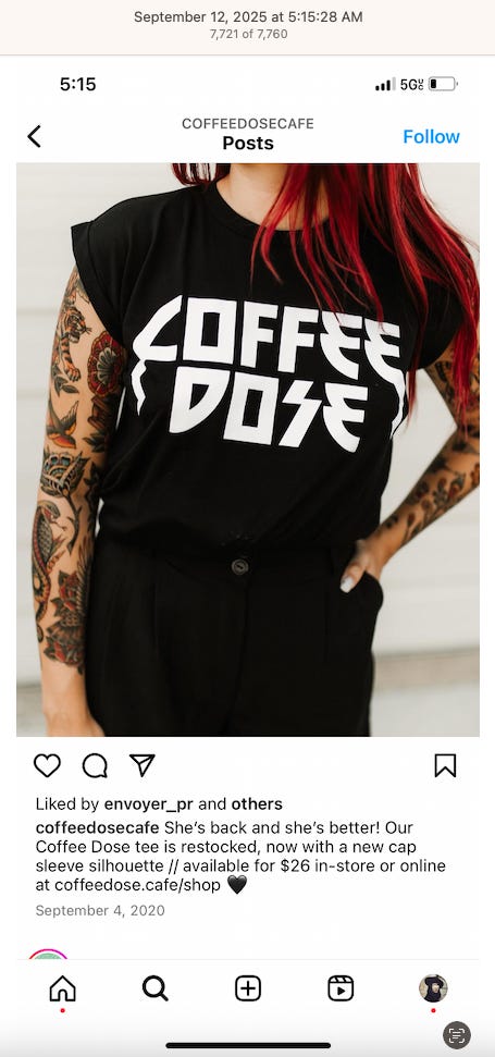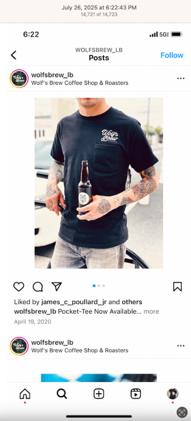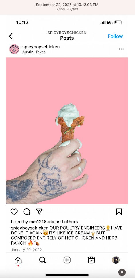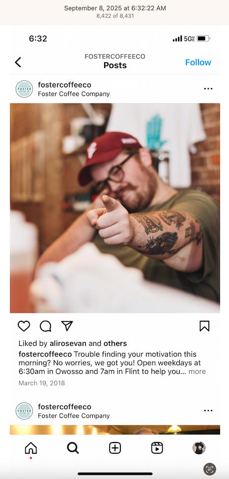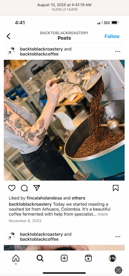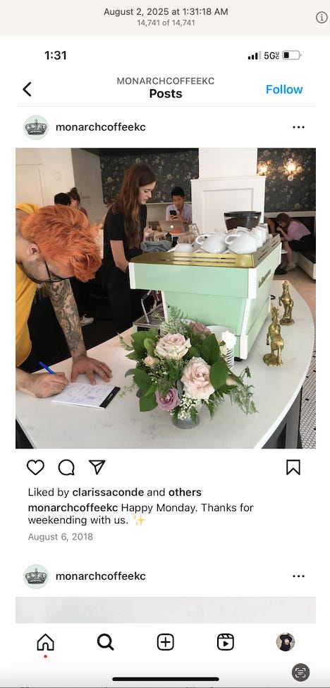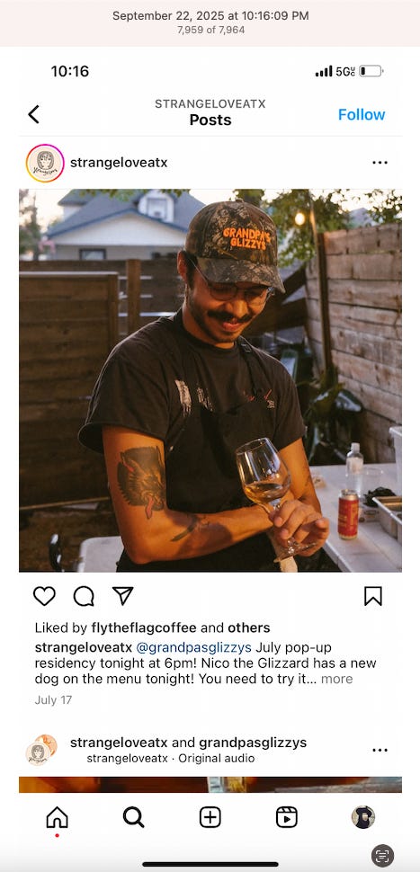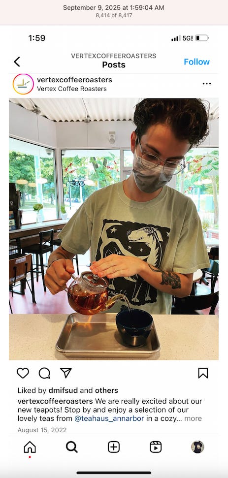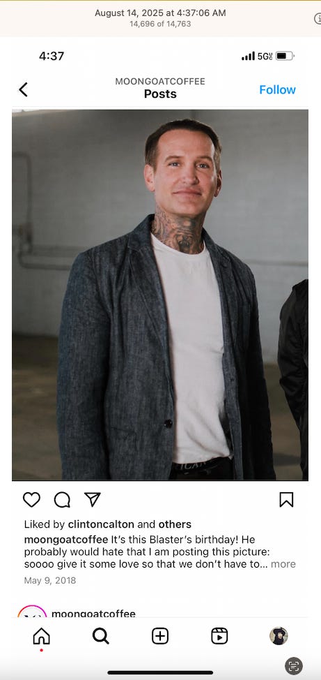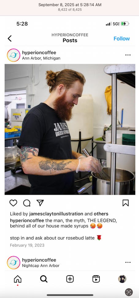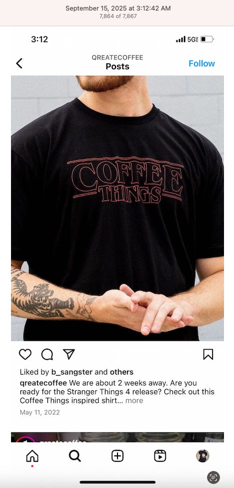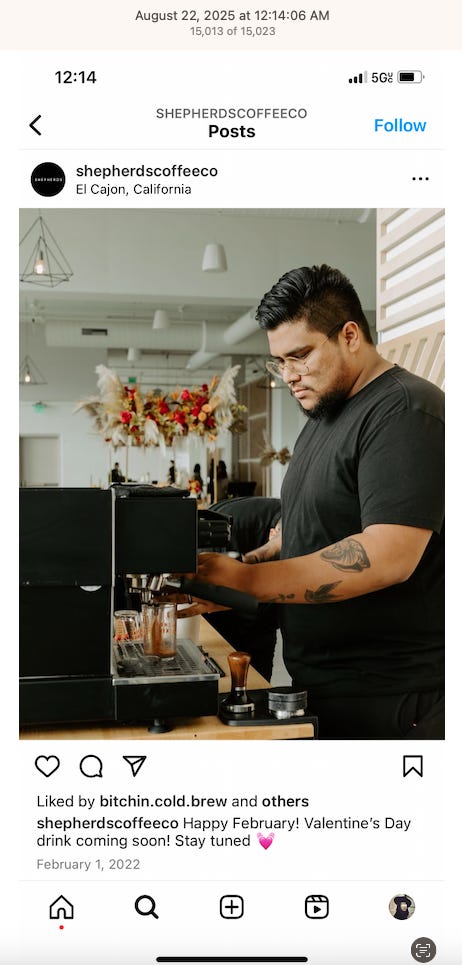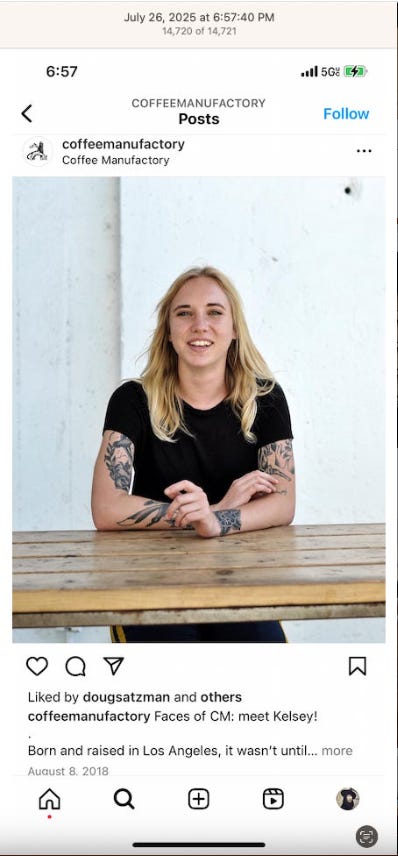 Screenshots above: Minnow's Instagram had another image of the person that gave his handle. That's how I landed on his Instagram for a better view of the tattoo that looks to be of the same model panther. Thump Coffee. Parsons Chicken. Common Place Coffee. Odd Luck Coffee.