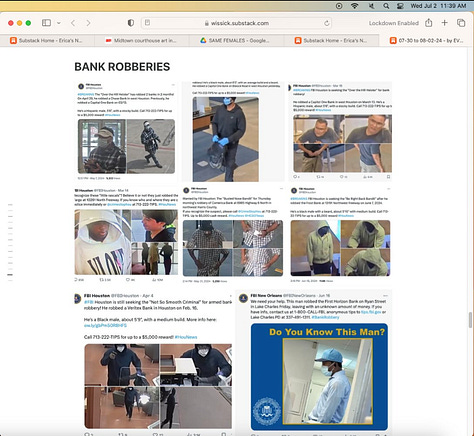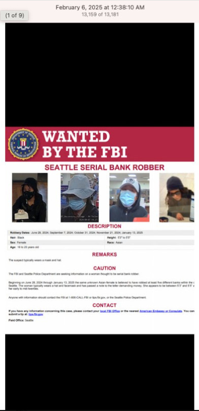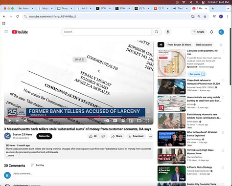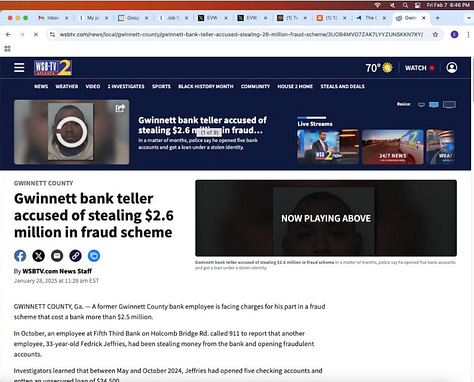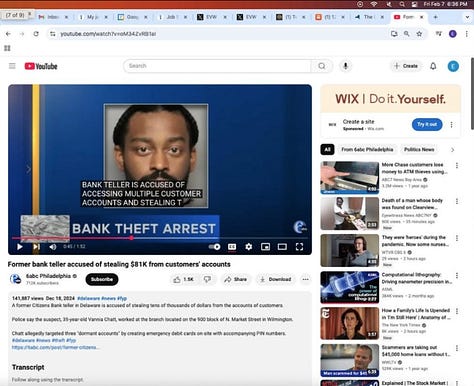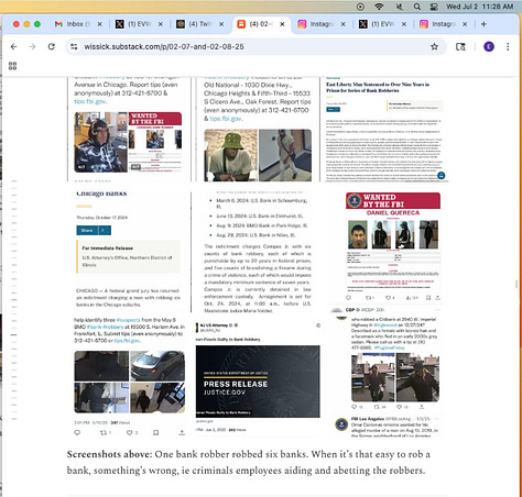 Screenshots above: Example of bank thefts. Some serial bank robbers of the same bank and some are minors. When it’s that easy to rob a bank in daylight in the age of cell phones and surveillance and a security guard at the bank, there’s collusion, an inside job, or something of that sort.