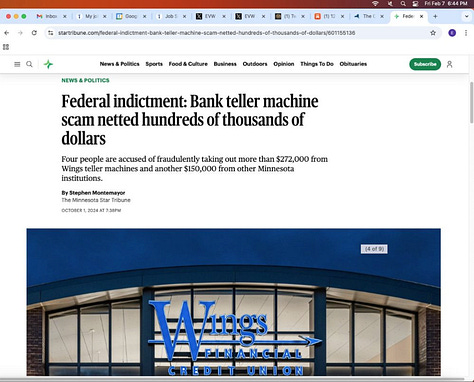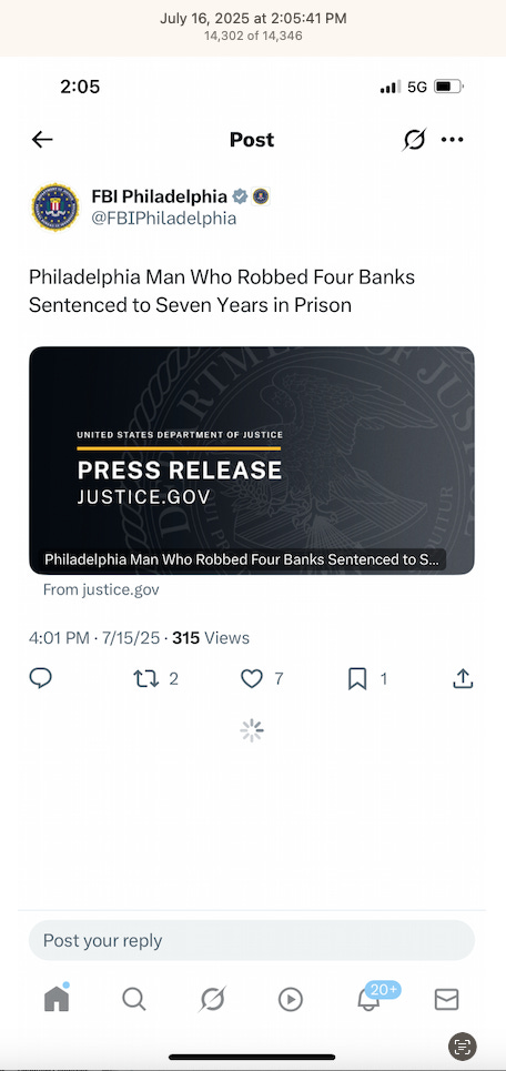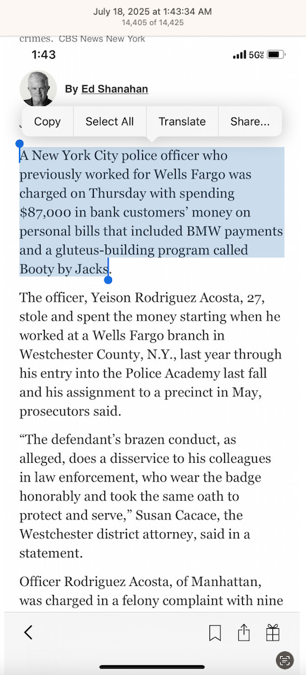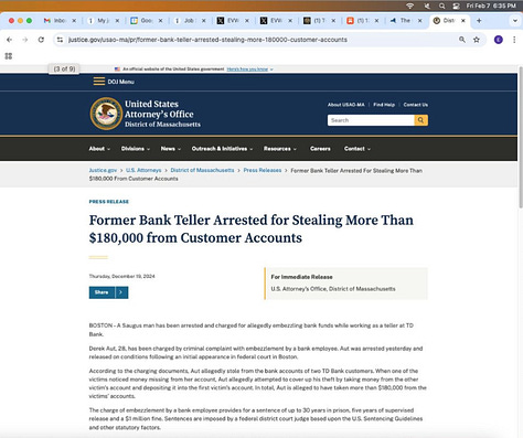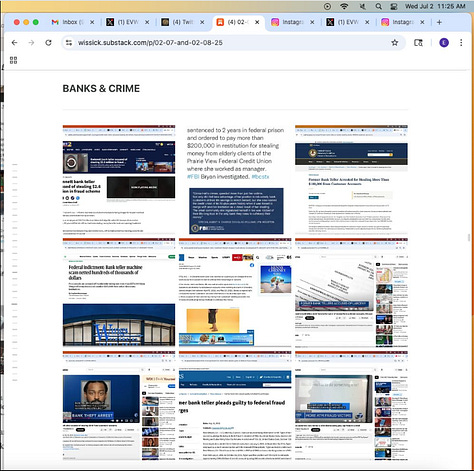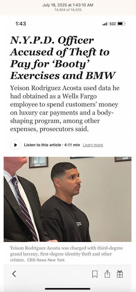 Screenshots above: Most recent news of a “serial bank robber” sentenced to 5 years in prison and an NYPD officer who formerly worked at Wells Fargo where he stole clients’ private information and identities that totaled $87k in theft.