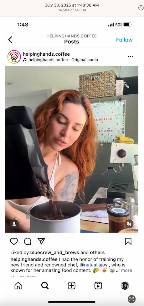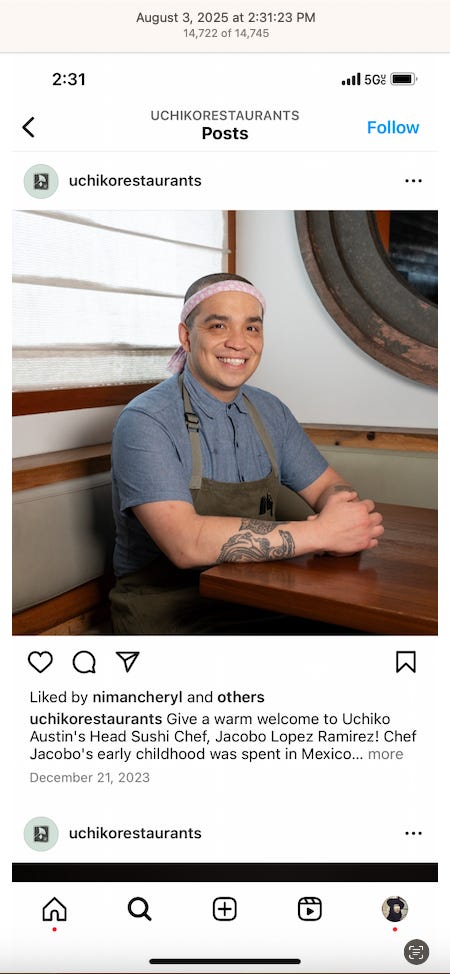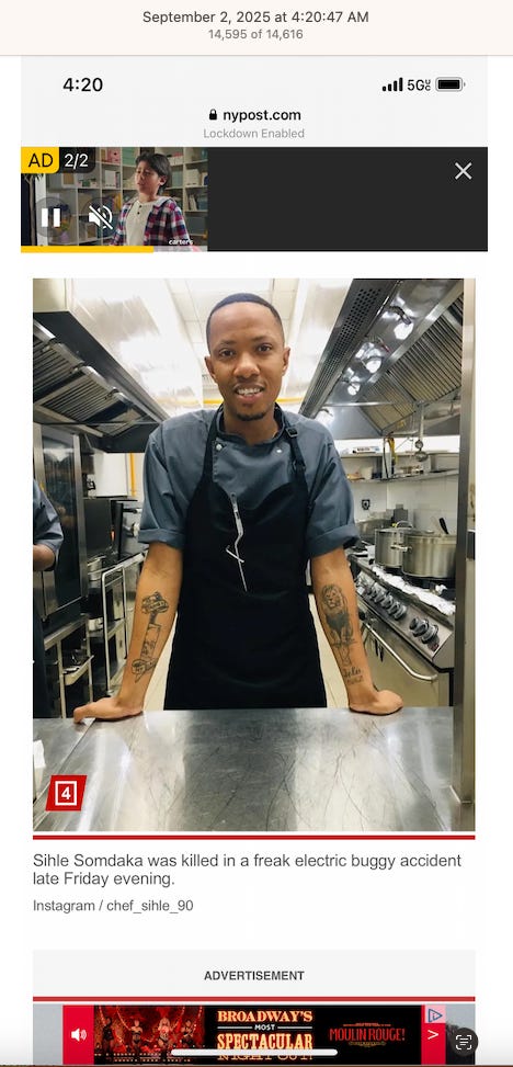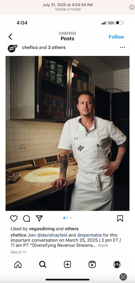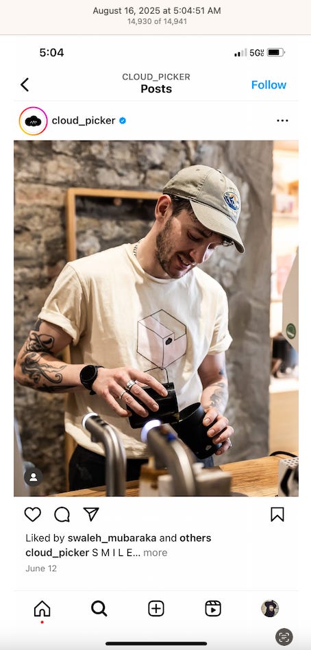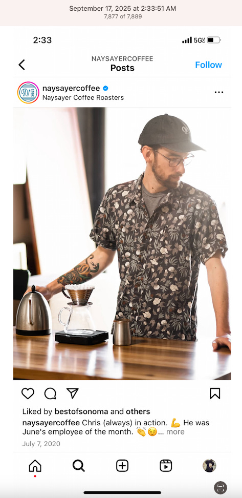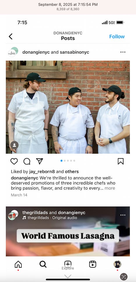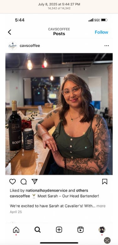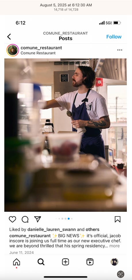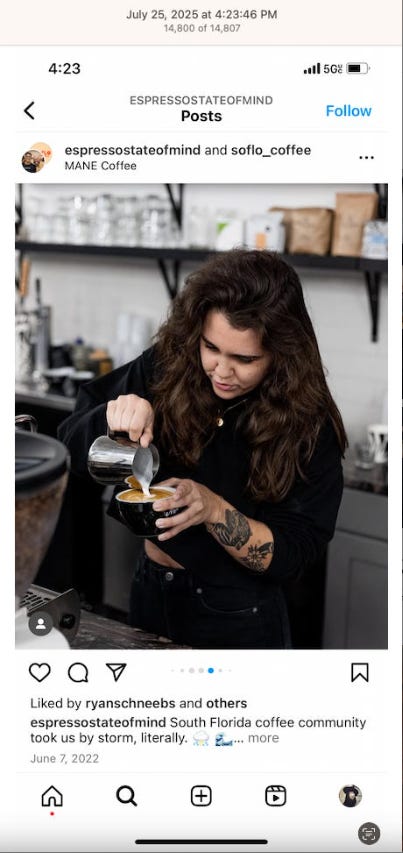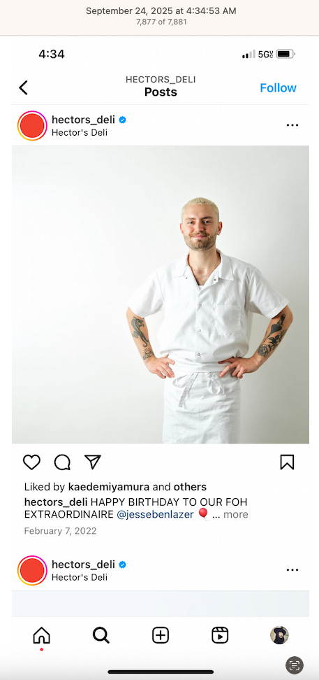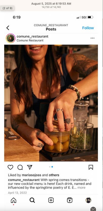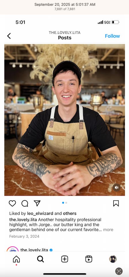 Screenshots above: Onda Pasta Bar. Keen Coffee. Case Study Coffee. Bolt Coffee Co. Middlestate Coffee. NY Post article of a “freak electric buggy accident” on Richard Branson’s private island in the Caribbean. Before employed on Branson’s island, person worked for restaurants in the Middle East, according to his Instagram.
