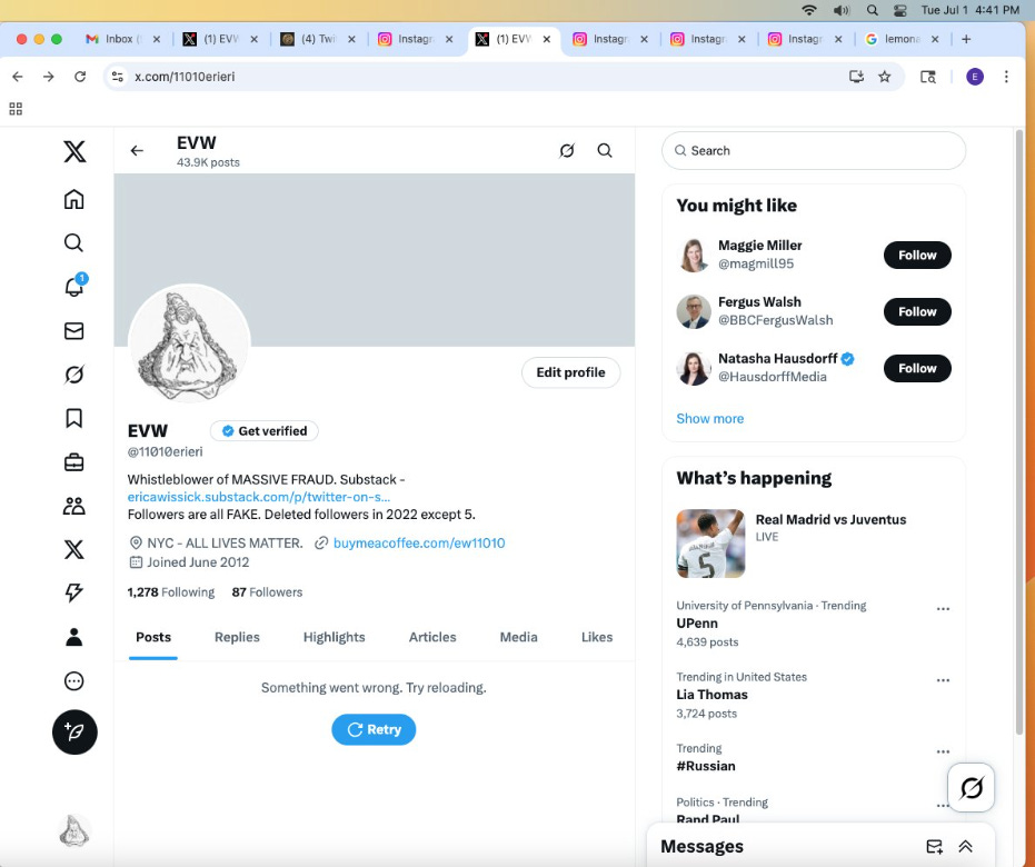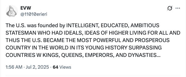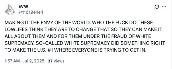 I FOR ONE AM ECSTATIC THAT THE TRUMP ADMINISTRATION IS GUTTING THE FEDERAL POSITIONS. THEY MAY SAY IT’S TO “REDUCE WASTE AND ABUSE” WHICH I INTERPRET AS “CUTTING OUT THE CRIMINAL INFLUENCE.” WE DON’T KNOW WHAT CLASSIFIED PROJECTS THE FEDEAL GOVERNMENT IS WORKING ON BUT I CAN INFER THAT THE CRIMINALS WHO HAVE BEEN HOUNDING ME SINCE 2022, MAKING ME THEIR FULL-TIME JOB, IS BECAUSE I’M A THREAT TO THEIR SCHEMES, NOT BECAUSE THEY HAVE NOTHING BETTER TO DO AND ENJOY WATCHING ME ALL DAY. THE CRIMINALS USED THE TWO ABOVE X POST IN THEIR EMAIL TO ME ON JULY 3RD IN WHAT WAS ANOTHER RACIAL HOAX THIS TIME CALLING ME A “WHITE SUPREMACIST.”