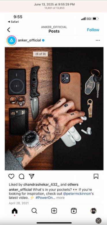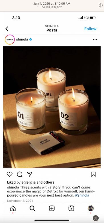 Screenshots above: Shinola makes "watches, leather, jewelry, hotels. Est. 2011." Its Instagram shows the usual themes: drip, candles as merchandise, and hints at “the squad.”