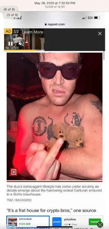 The jury of 8 males and 4 females found Sean Combs not guilty of the most serious charges and guilty of transportation for prostitution despite his two former girlfriends testifying on their experiences of emotional, psychological, physical abuse and coercion. There was even a video of physical abuse when Combs pulled the hair and kicked the one repeatedly. Both reflected a toxic relationship of power dynamics. Let's see if the two crypto guys who allegedly kidnapped and tortured their Italian associate get the same treatment. Reminder: the Italian was documented doing drugs, partaking in orgy, clubbing, dining out, walking freely about. That doesn't count to me as exactly kidnapped. He ran out the house, what sounds like he could've done other times before.