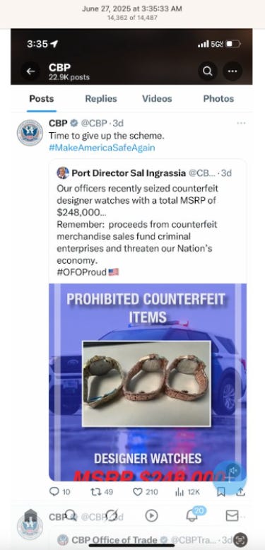 Screenshots above: Candles are one of the most common merchandise found on brands and business's Shop. Recent CBP X posts on counterfeit watches.