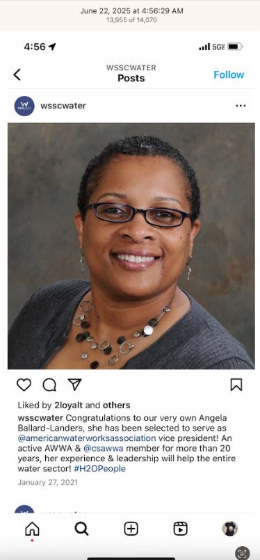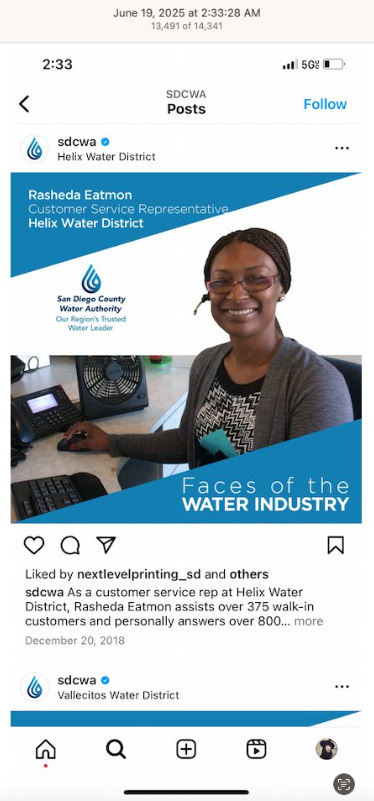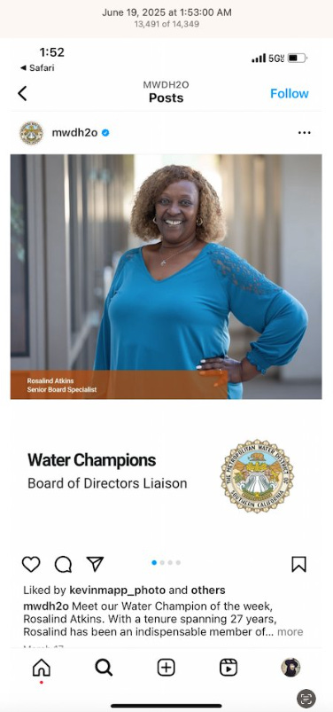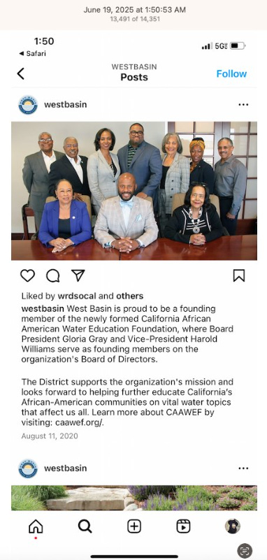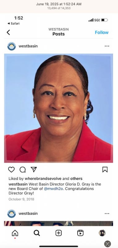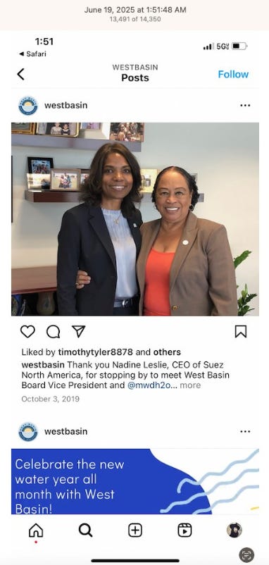 Screenshots above: Director & Board Chair, West Basin Municipal Water District, CA. President & VP, West Basin Municipal Water District & African American Water Education Foundation, CA. CEO, Suez North America. Sr Board Specialist, Metropolitan Water District of Southern CA. Sr Environmental Specialist, Metropolitan Water District of Southern CA. Director, San Diego County Water Authority, CA. Information Technology Manager, San Diego County Water Authority CA. Director of Bereavement, Coastal Hospice. VP, For Family Health/NYC.