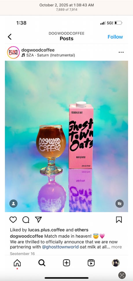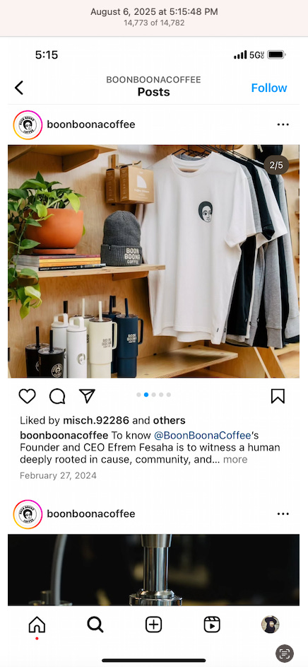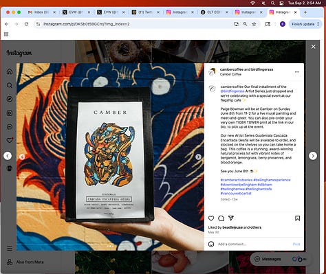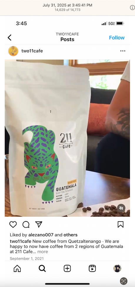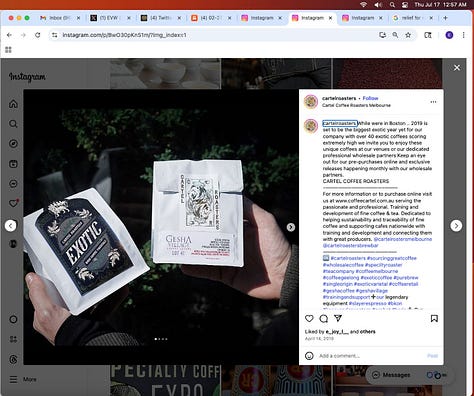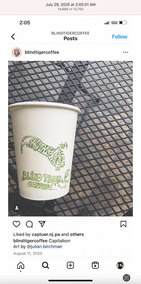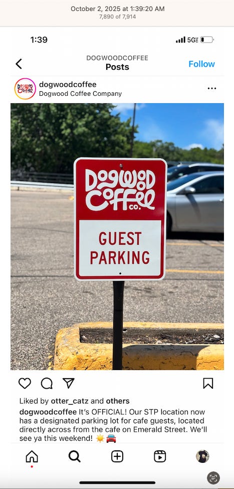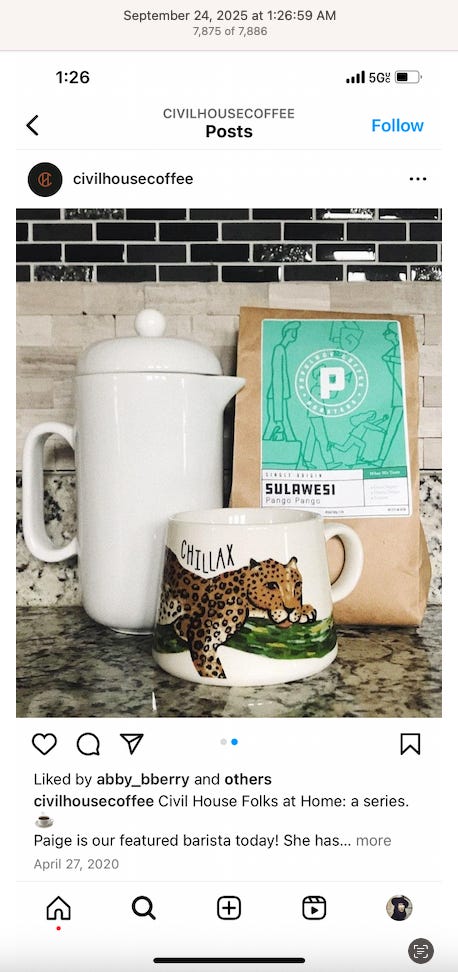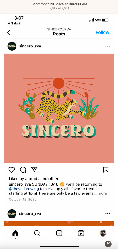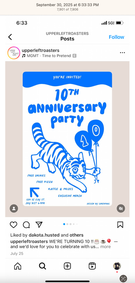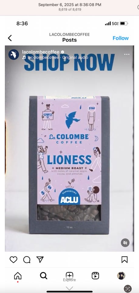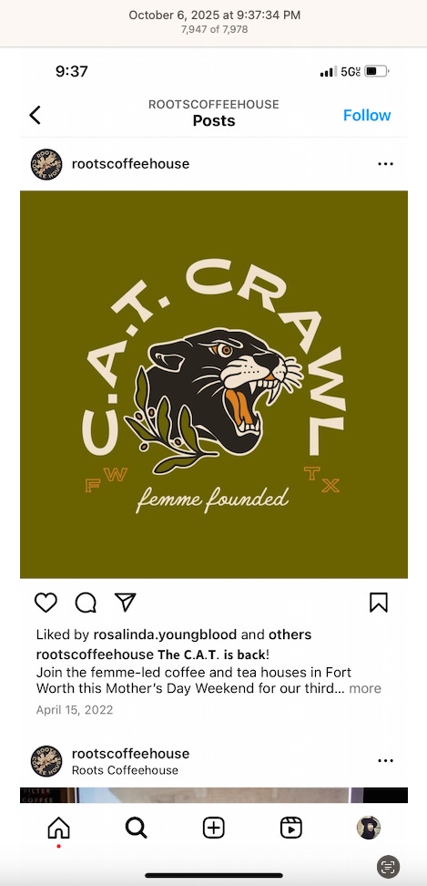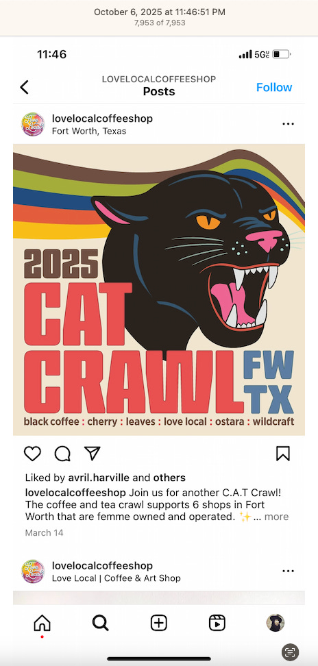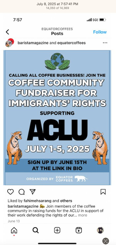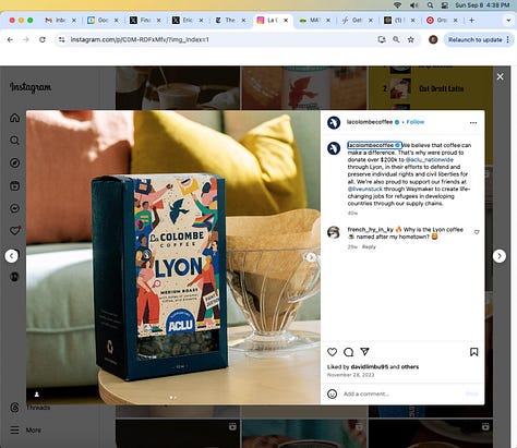 Screenshots above: 626 Hospitality. Shuggies Pizza. Equator Coffee and ACLU partnership for “immigrant rights.” Nine Lives thrift store. Mighty Peace Coffee. Gallant Tiger. Cartel Roasters.