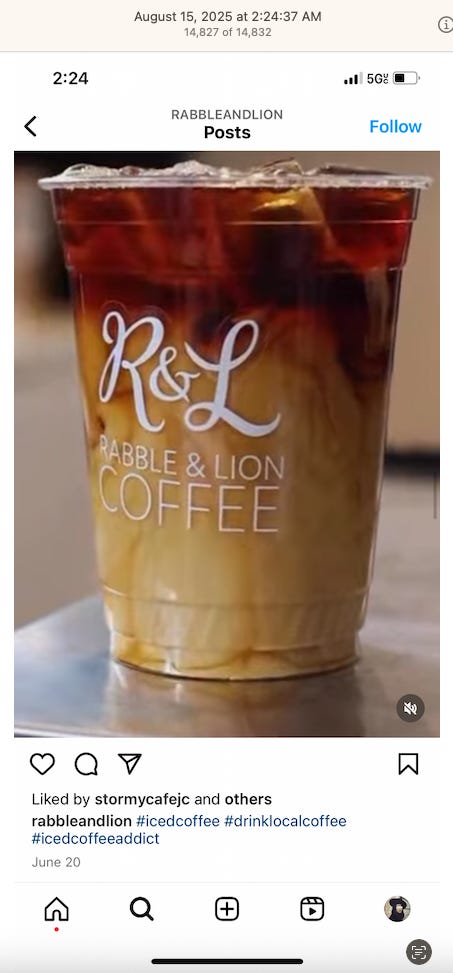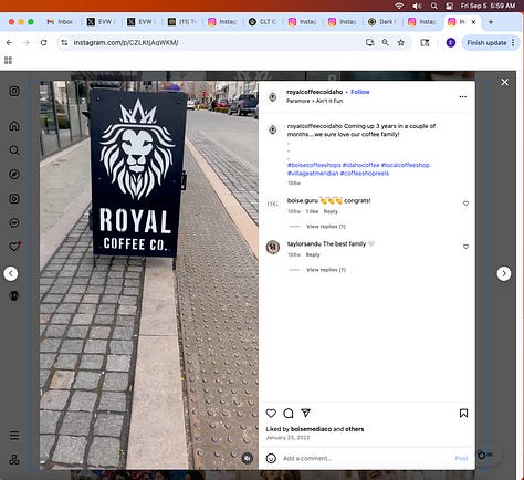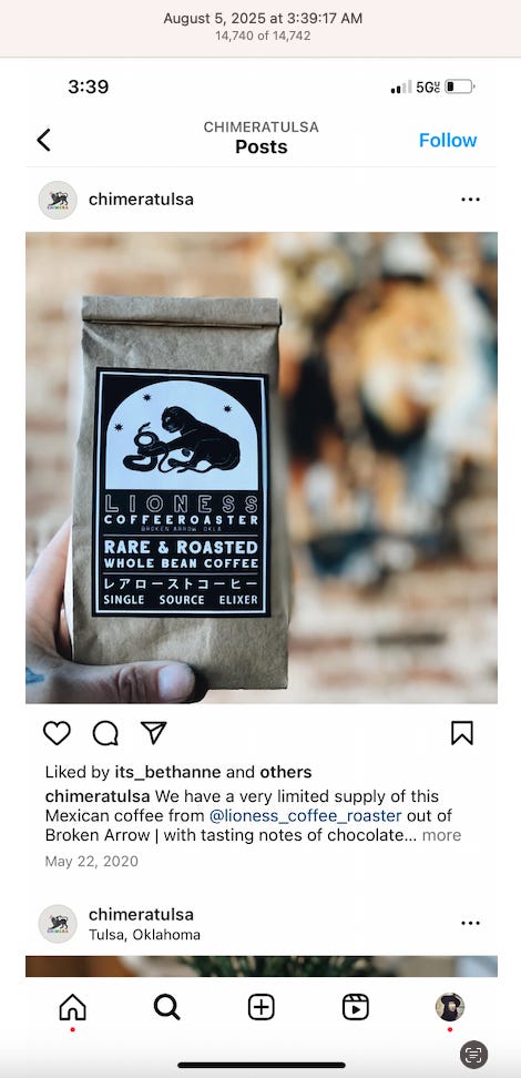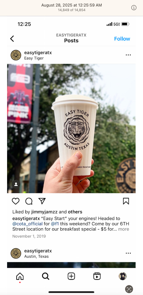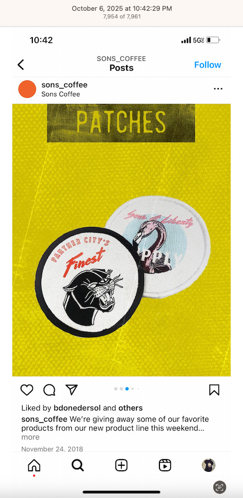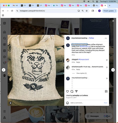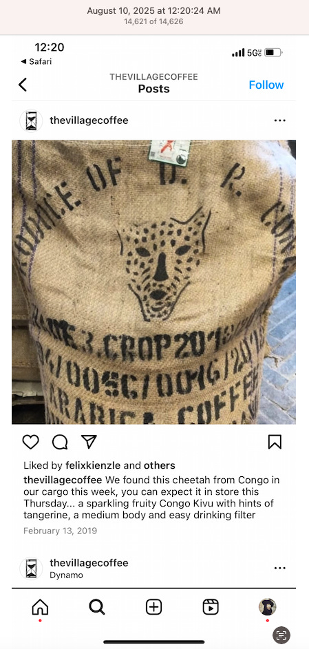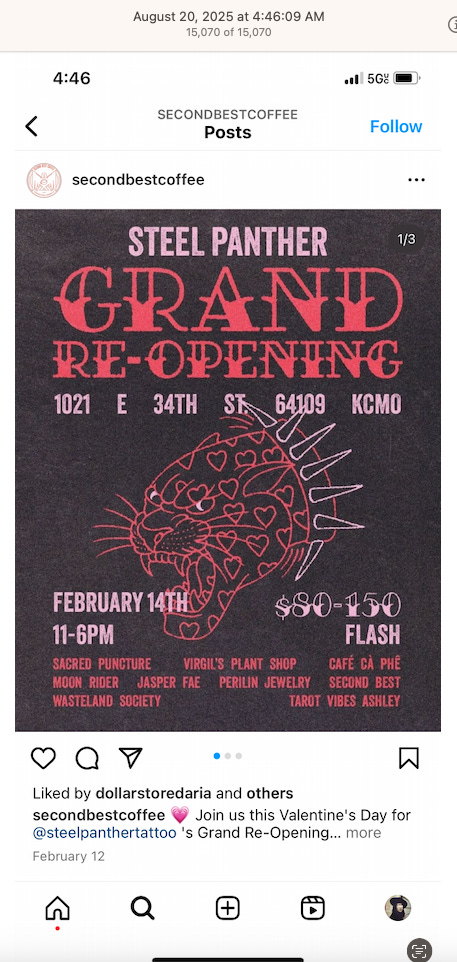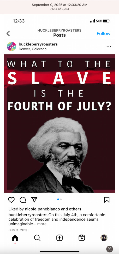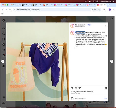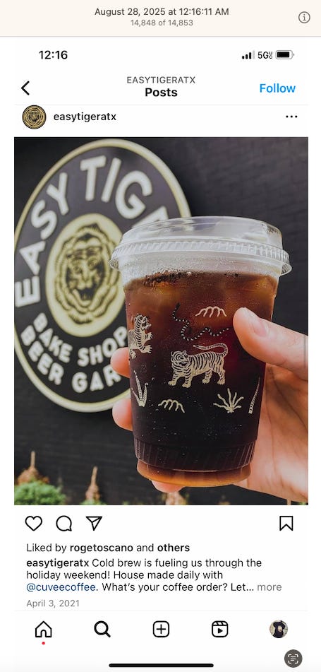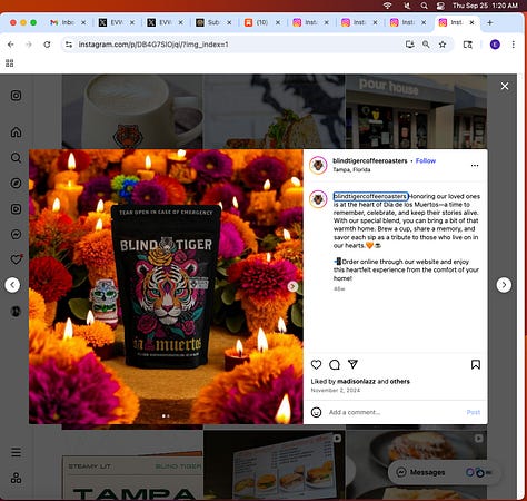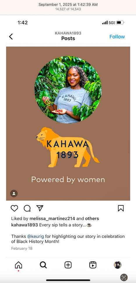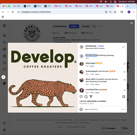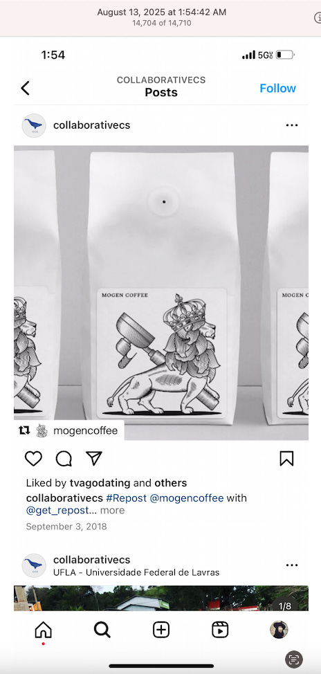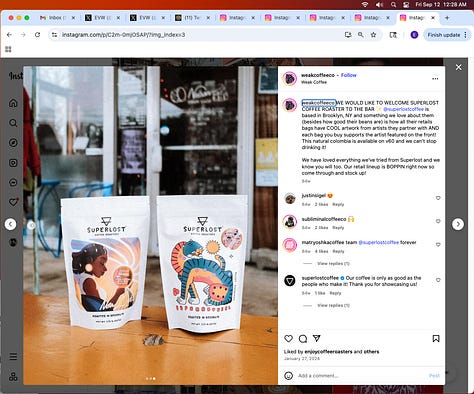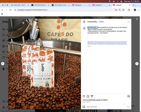 Screenshots above: 626 Hospitality. Shuggies Pizza. Equator Coffee and ACLU partnership for “immigrant rights.” Nine Lives thrift store. Mighty Peace Coffee. Gallant Tiger. Cartel Roasters.