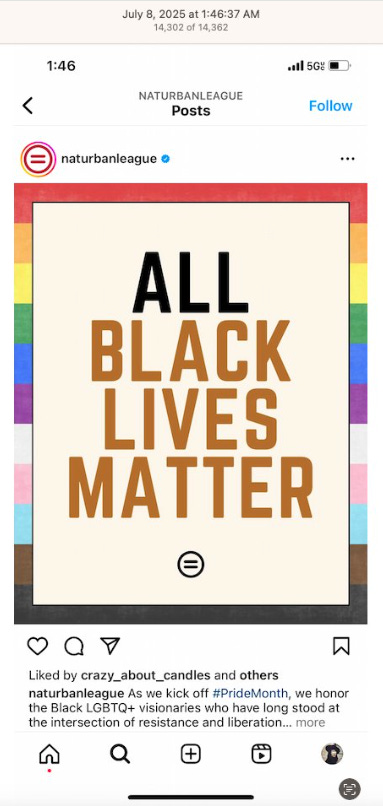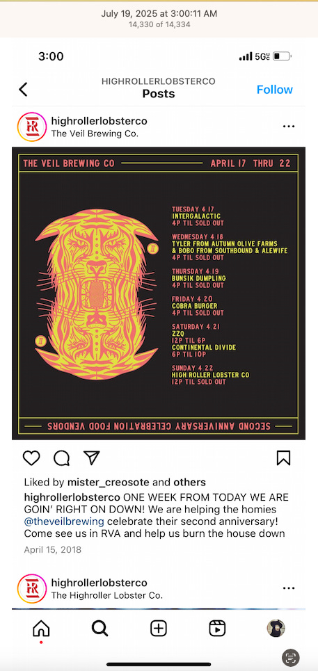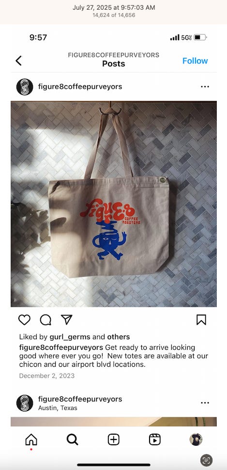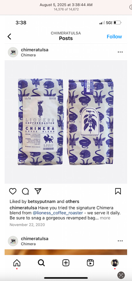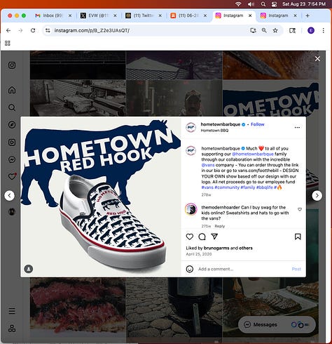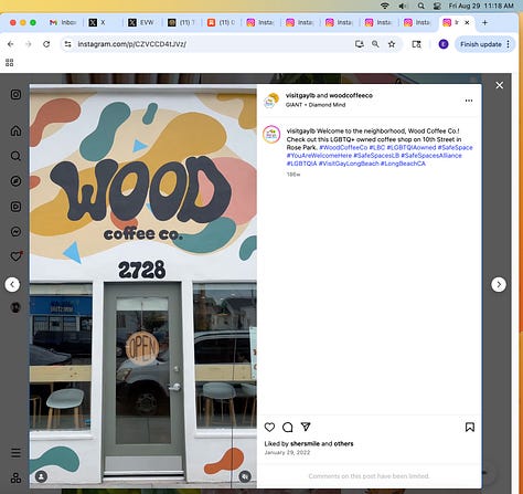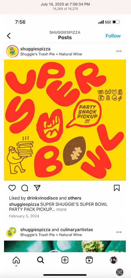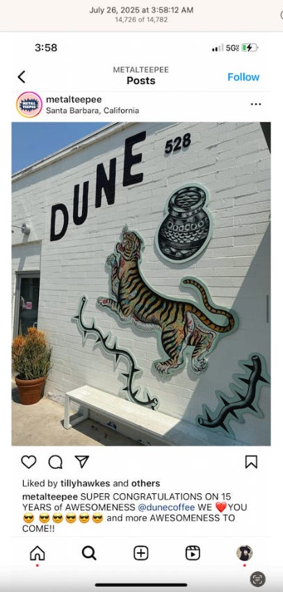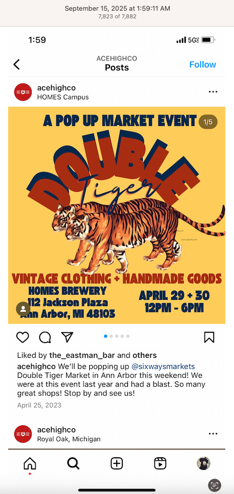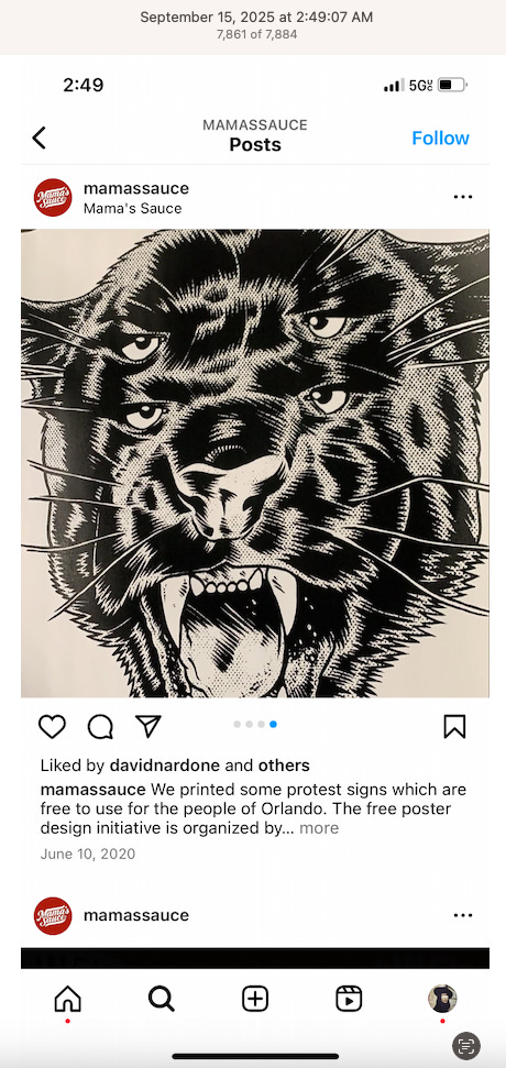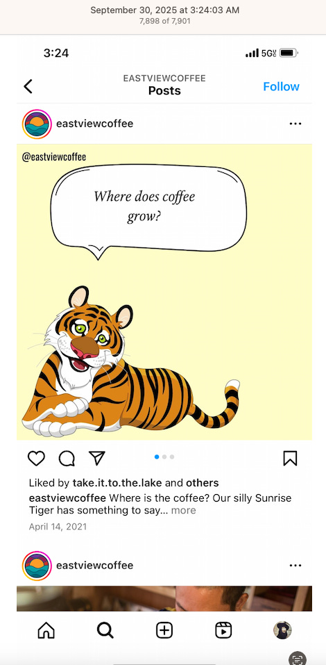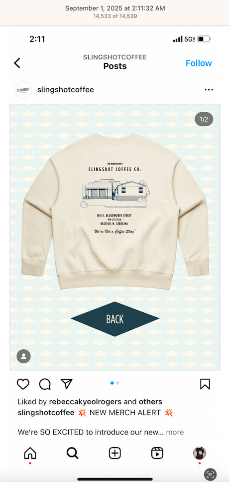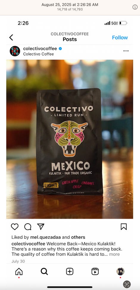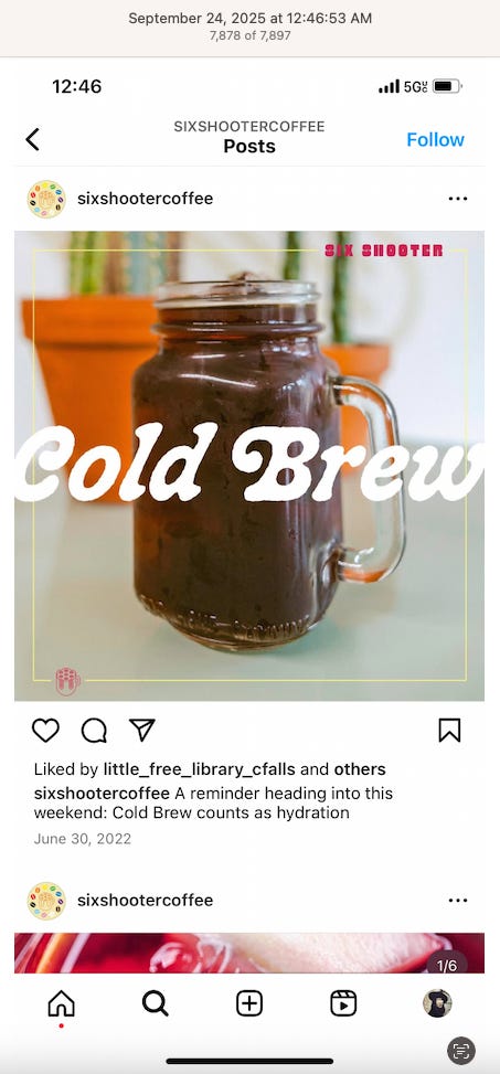 Screenshots above: 626 Hospitality. Shuggies Pizza. Equator Coffee and ACLU partnership for “immigrant rights.” Nine Lives thrift store. Mighty Peace Coffee. Gallant Tiger. Cartel Roasters.