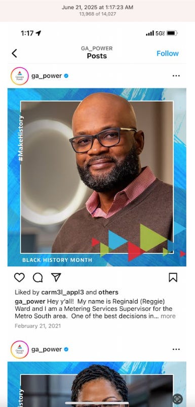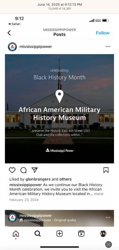 Screenshots above: Red Cross Illinois endorses National Museum of African American History and Culture on it Instagram. Mississippi Power promoting African American Military History Museum on its Instagram.