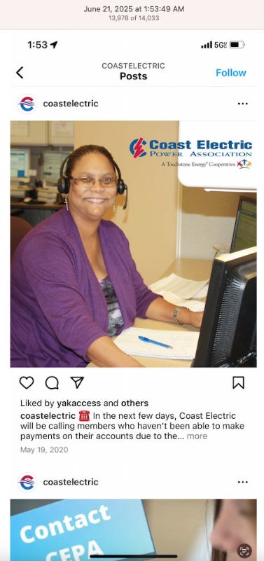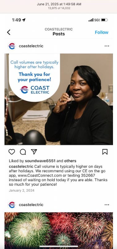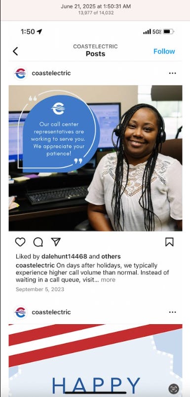 Screenshots above: Customer service and other employees: Southwestern Electric Power Co. Gas South. DC Water. Indiana Michigan Power. Red River Bank. Coastal Electric. Coasta Electric.