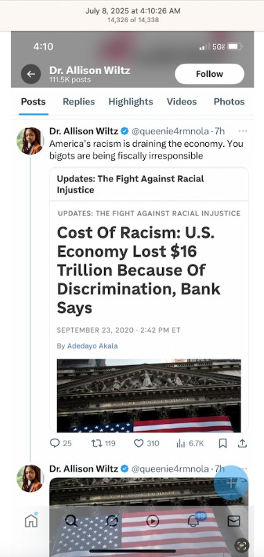 Screenshots above: In the meantime, "systemic racism" runs rampant in the U.S. according to the profile above. Note the background image shows tigers/big cats.