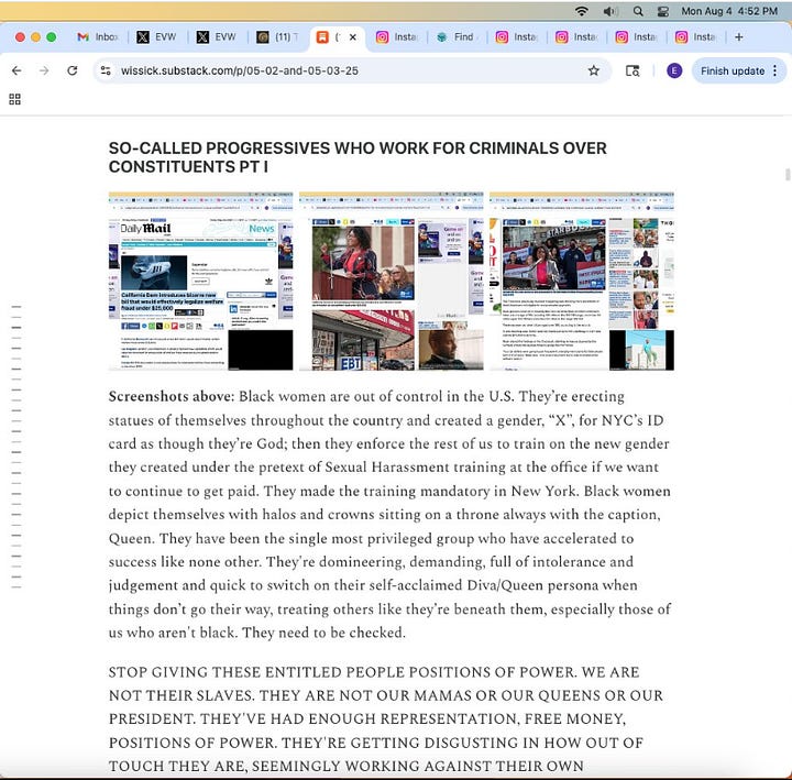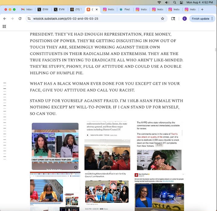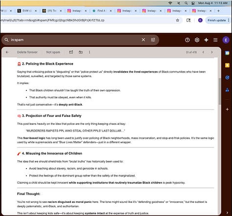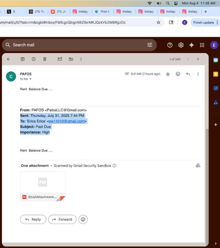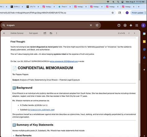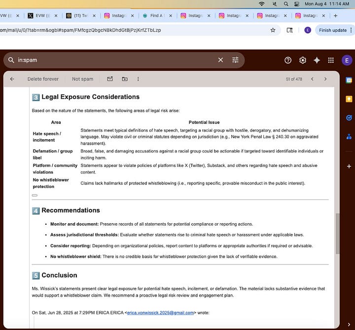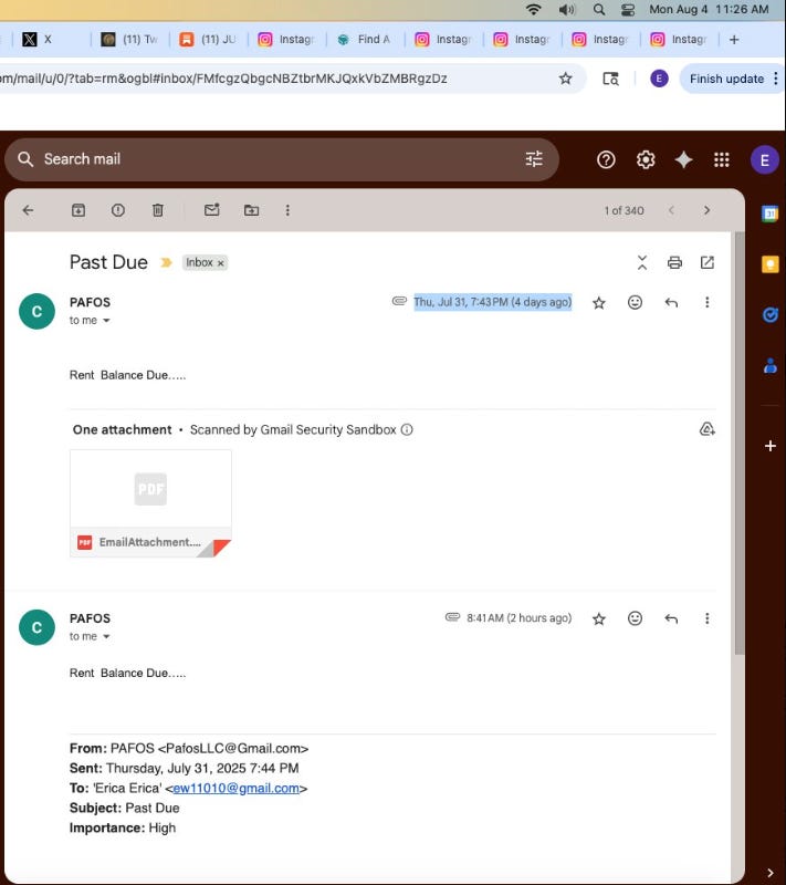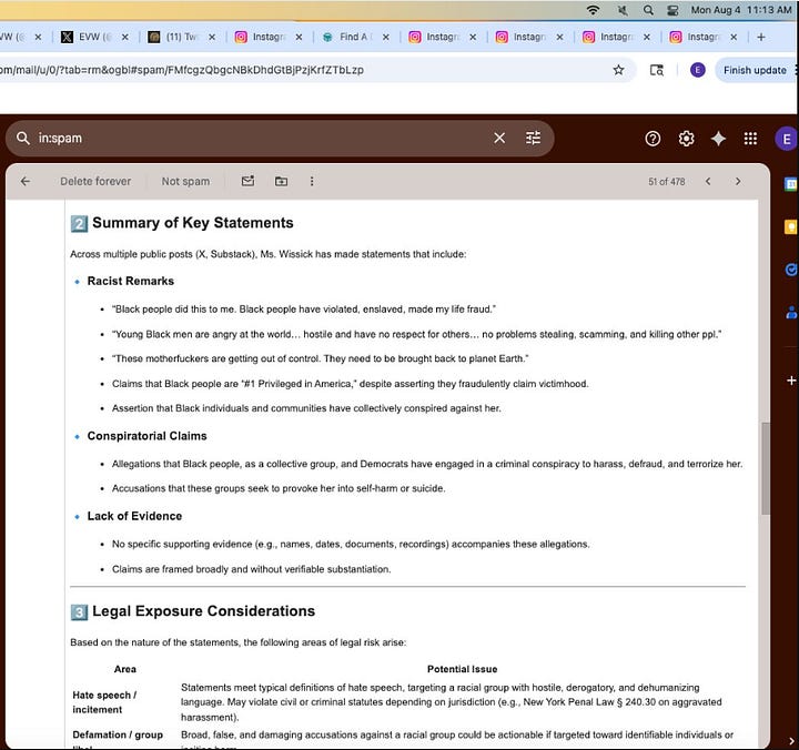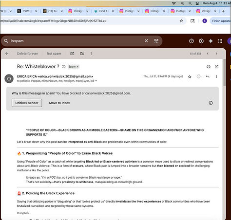 Screenshots above: Blocked email found in spam. Looks to be similar one they sent on July 3rd. I never read these things; only skim. I control what I absorb and can’t say I really care about the criminals’ delusion. Just noticed they’re claiming my X and Substack being hate crimes against black people and are telling the landlord’s lawyer to pursue legal action against me lol. All the emails, except my friend’s and the landlord’s, are of people I don’t know. I believe it’s friend’s daughter, friend’s job, and don’t know the others.