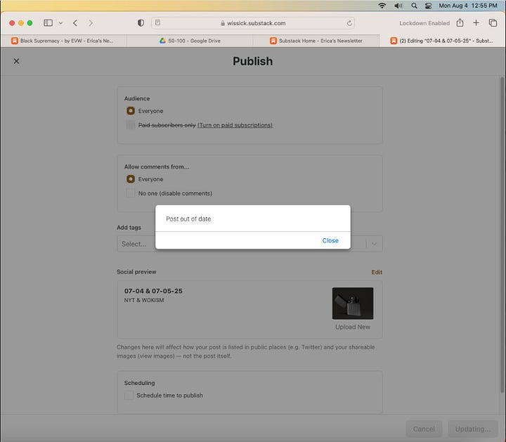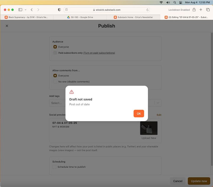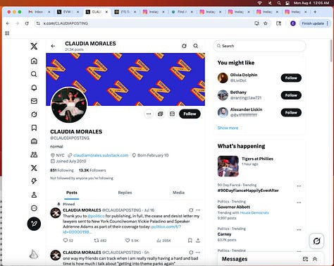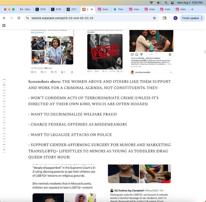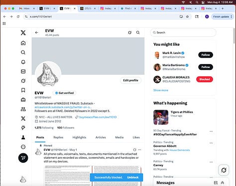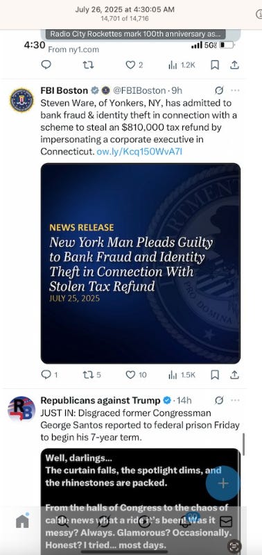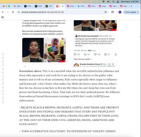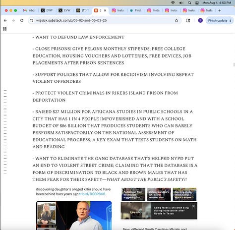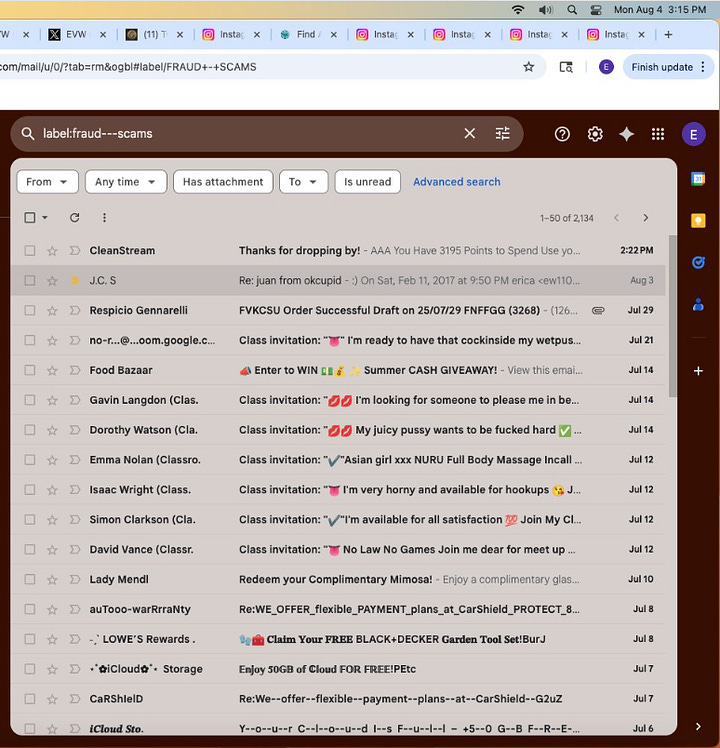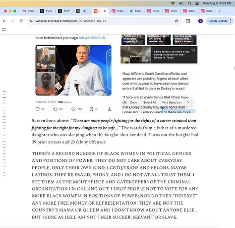 Screenshots above: Blocked email found in spam. Looks to be similar one they sent on July 3rd. I never read these things; only skim. I control what I absorb and can’t say I really care about the criminals’ delusion. Just noticed they’re claiming my X and Substack being hate crimes against black people and are telling the landlord’s lawyer to pursue legal action against me lol. All the emails, except my friend’s and the landlord’s, are of people I don’t know. I believe it’s friend’s daughter, friend’s job, and don’t know the others.