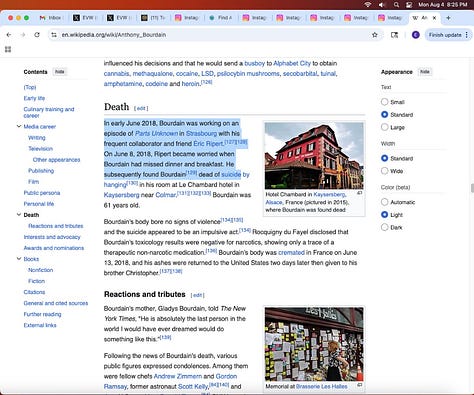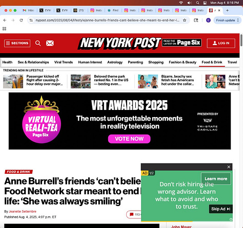 Screenshots above: Just want to point out that Anne Burrell's death that's deemed a suicide is also a shocker to those close to her as Anthony Bourdain's was in 2018. His mother is quoted in a publication that he was the last person she would've imagined to have taken his own life. Burrell was a lesbian; Bourdain was a social justice advocate through food and traveling. To me, both the suicides are part of list of mysteries as Kohberger murders, why the secret service's technology wasn't properly functioning on the day of the attempted assassination or what motivated Crooks to want to assassinate in the first place, why Luigi Mangione who never had a criminal record suddenly murdered at point black a UHC exec. Just saying, that's all.