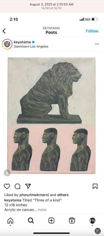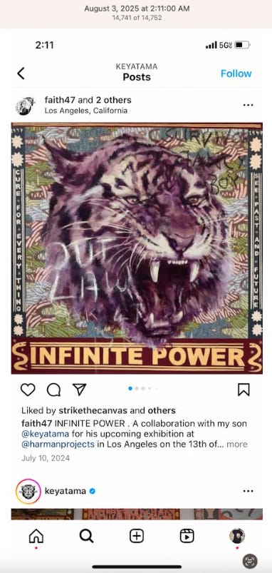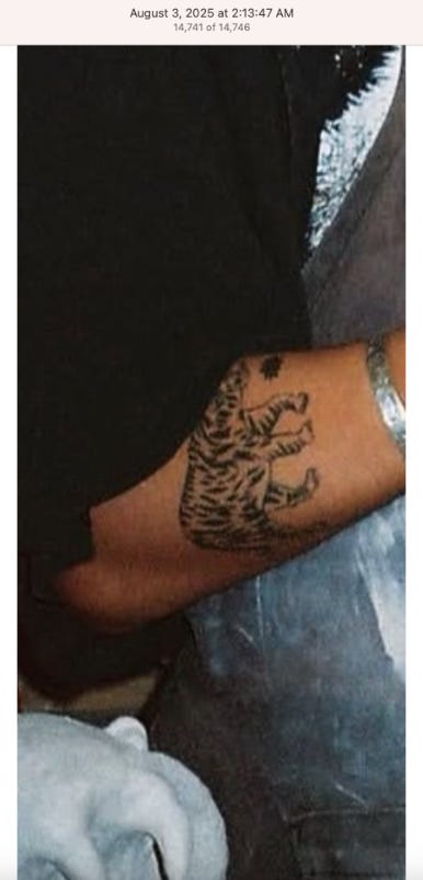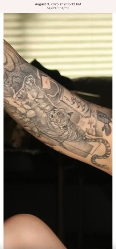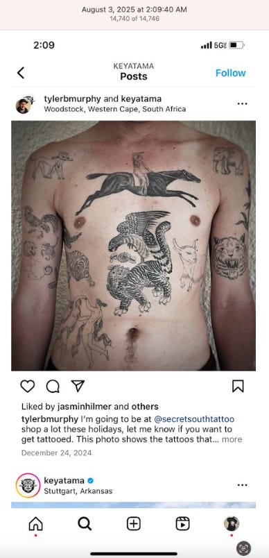 Screenshots above: From the South African artist’s Instagram. The first is of him showing multiple big cat tattoos.