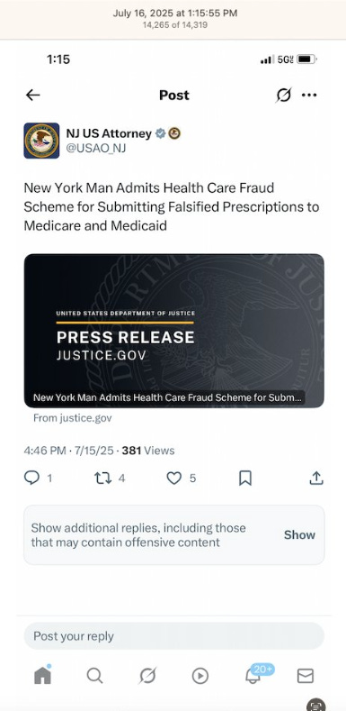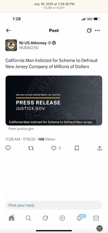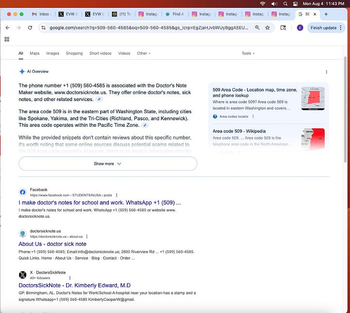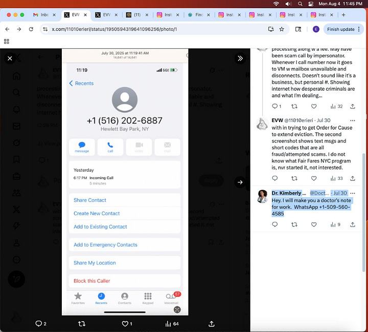 Screenshots above: Just noticed while transferring to Substack. There's even a doctor's note scam on top of the romance scams, broker/apt scams, job scams, puppy/kitten scams, EZ Pass scams, parking ticket scams, USPS/FedEx/UPS scams, etc. Just by mentioning “doctor’s note” in my X post generated a bot who left a number to contact for a fraudulent doctor’s note that most likely comes with a fee, if not a fee, gathering private information that would eventually lead the criminals to one’s bank acct or credit card. This is how suspect the internet has become. Booby traps are everywhere to scam and defraud unsuspecting victims like landmines. We have to constantly be on the watch, or do what I do, stop all online orders altogether. The criminals have at their disposal countless phone numbers.
