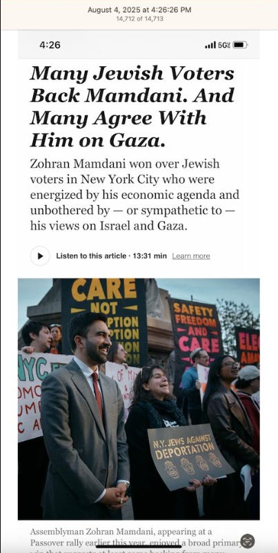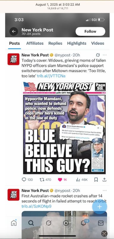 Screenshots above: Always the Post and NYT are night and day in how they present the radical. I find it incredibly hard to believe that after a shooting in midtown Manhattan--only two this yr w the other Luigi Mangione—that NY'ers would vote for an inexperienced, terrorist sympathizer who.
