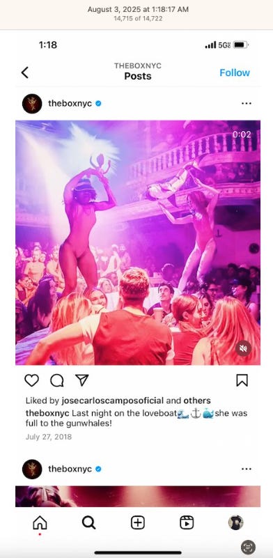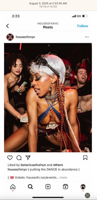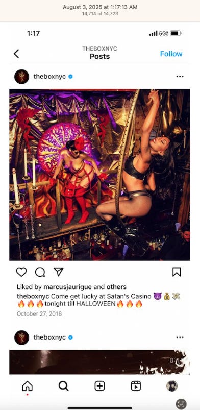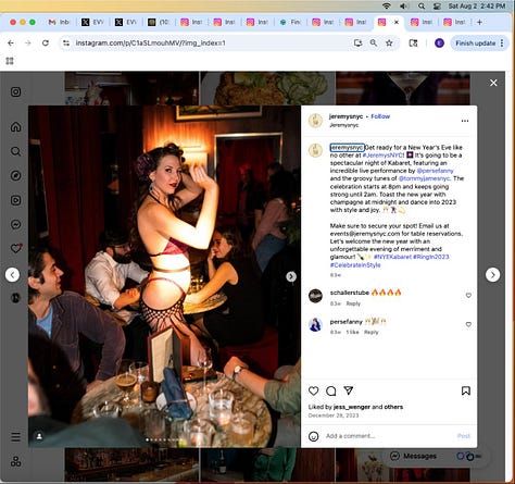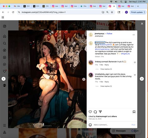 Screenshots above: Along with drag queen shows at City Council meetings and random restaurants are cabaret performances (Jeremy's, The Box, House of X, Public Hotels). All are a trend throughout NYC and probably other cities.