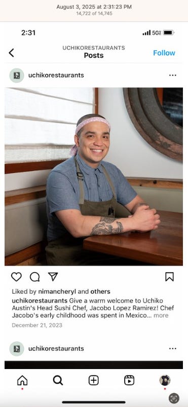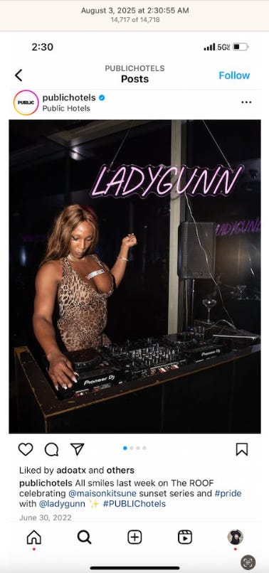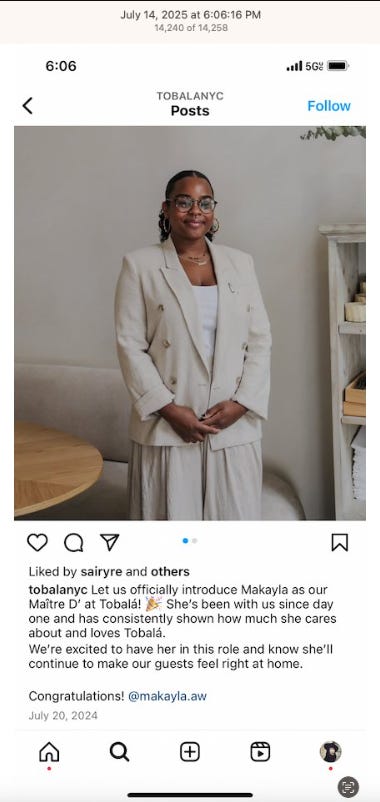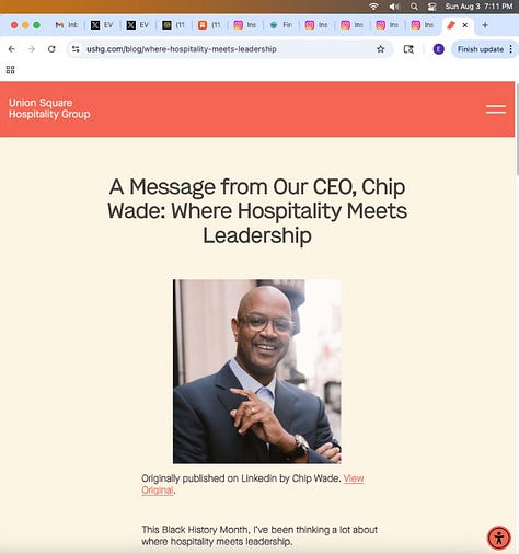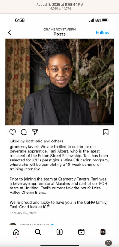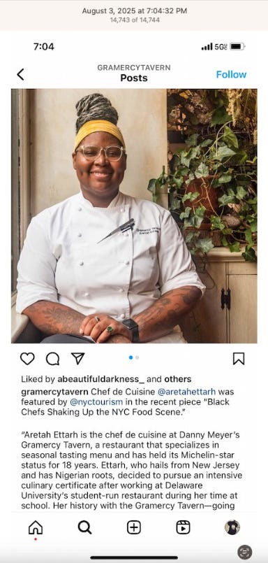 Screenshots above: Union Sq Hospitality Group: CEO. Chef, who's been nominated for Beard Foundation’s Best Chef and featured in NYC Tourism "Black Chefs Taking Over NYC", among other publications and platforms, eg Eater. Fulton Street Fellowship and selected for "ICE's prestigious Wine Education program..." If you look at the chef's Instagram, you can see what year she gets several of her tattoos. She also has familiar business endorsements that seem to be criminally influenced with repeat people and the usual themes of sneakers, nails, political messages, and DEI of only POC/ LGBTQ+ staff.