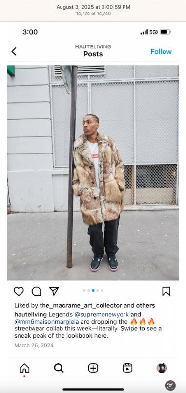 Screenshots above: Just like everything else, one look/dominant representation and culture. Shocked to see Supreme designing fur coats and apparently it does weave now.