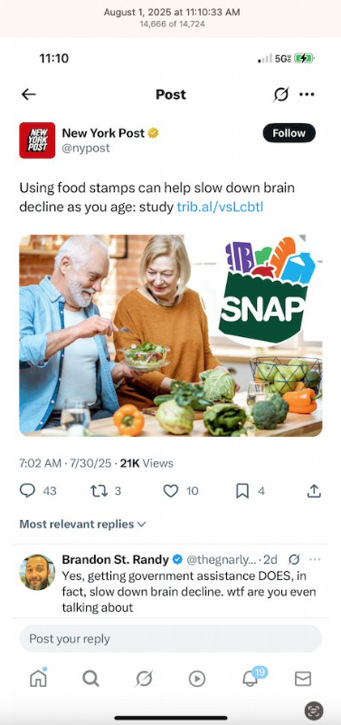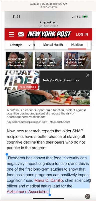 Speaking of the NY Post: Look how obviously influenced and misleading the title of this article is—"Using food stamps can help slow down brain decline as you age." As though food stamps alone cures brain decline. It's not food stamps but food security and nutrition that maintains a healthy brain.
