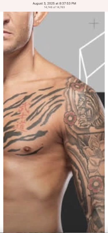 Screenshots above: Another musician with lion tattoos. The two that are visible based on the images online is one on his chest of a lion and another on the back of his shoulder behind the stars.