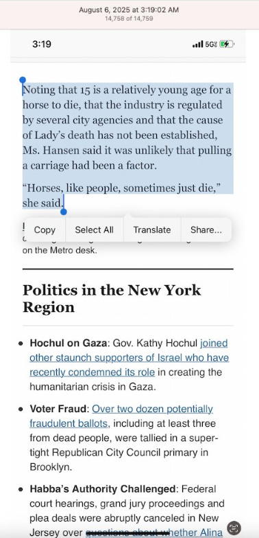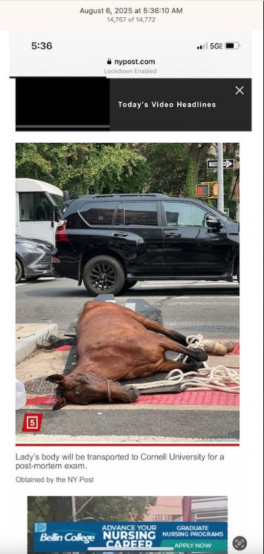Screenshots above: The last paragraph has the criminals' touch off, We take you for suckers who believe anything your screen tells you. "Noting that 15 is relatively young age for a horse to die..." But the article ends with "Horses, like people, sometimes just die." No; people don't just drop dead unless there's something wrong, and that's the same for any other animal. A young healthy horse does not drop dead just like a young healthy person does not just drop dead. The city's agencies and wherever the horse will be evaluated for its cause of death is meaningless because NYC is a criminally hijacked city and very much under criminal influence by hijacked critical infrastructure. That should be evident by now after all I've shown.