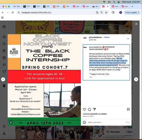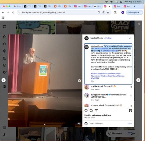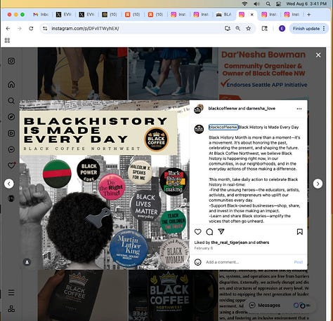 Screenshots above: Another highly politicized, black-owned coffeeshop. It would take a very gutsy white male to enter this business. Usual themes: targeting the young for indoctrination via books, internships, culture outings, scholarships, etc. One wonders where all the funding is coming from.