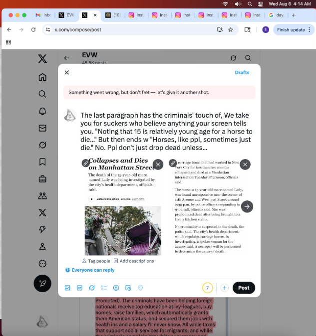 Screenshots above: Pointing out the deliberate exclusion of the images of the dead horse in NYT compared to the Post. This is why I prefer the Post these days and view NYT strictly for its criminal influence.