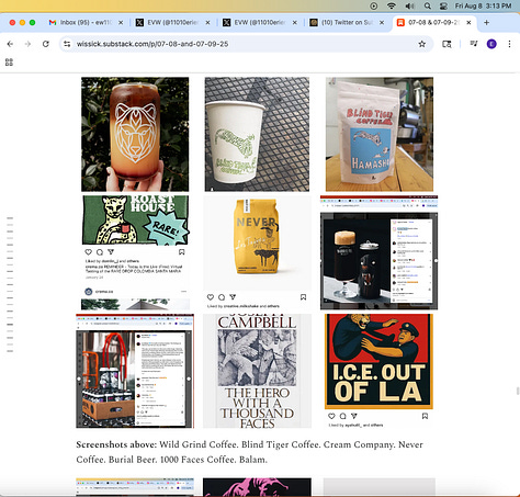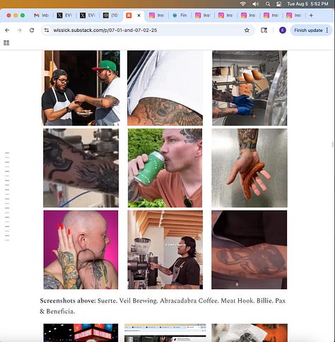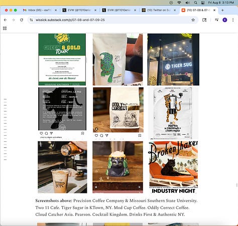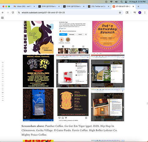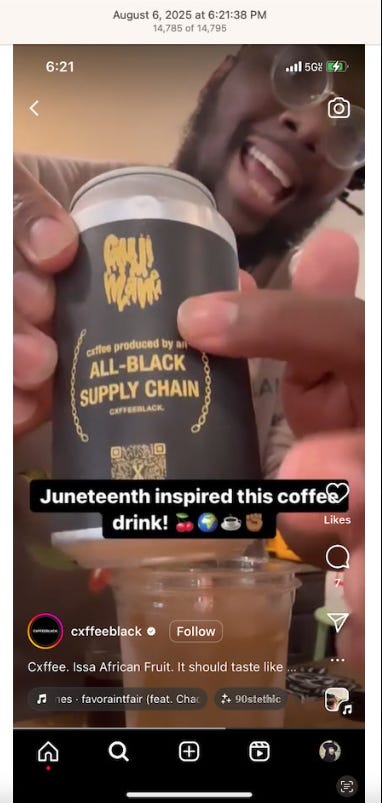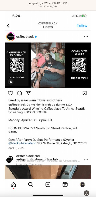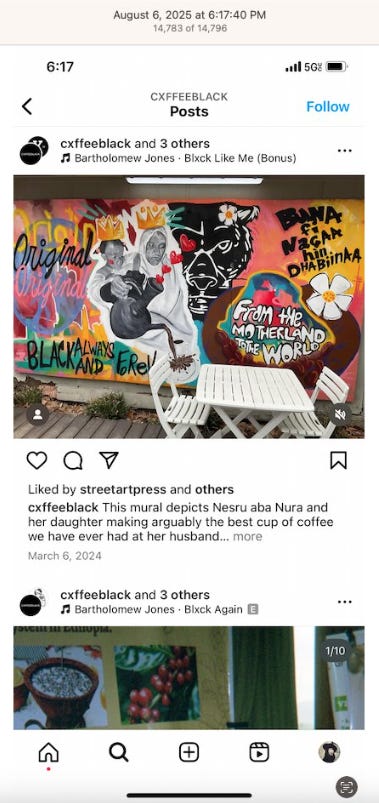 Screenshots above: Another political, black-owned coffee shop. This one focuses on “anti gentrification.” Lots of images of panthers, QR codes, merchandise. It also offers internships. It had its own documentary on coffee that took places in various cities in U.S. and in Africa, along with the business featured on local news.