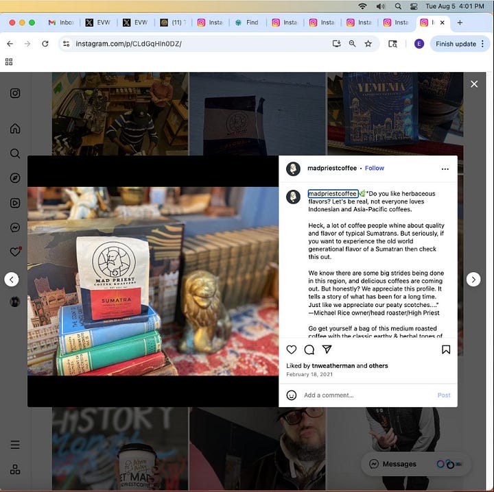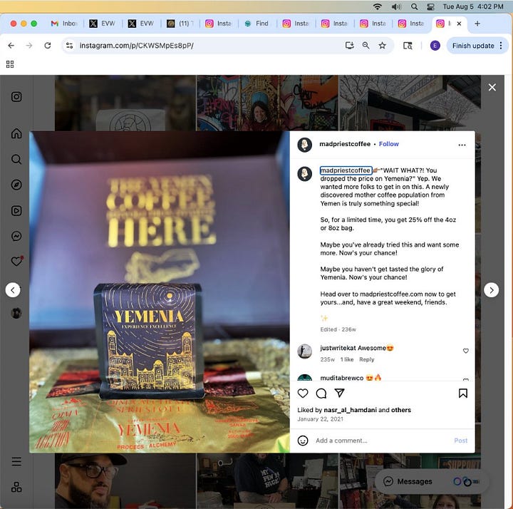 Screenshots above: Yemen is also another country I see a lot for coffees. Second image shows lion in the background. Seems that there has to be at least one representation of a big cat to all the Instagram accounts of criminal/hijacked businesses and brands.