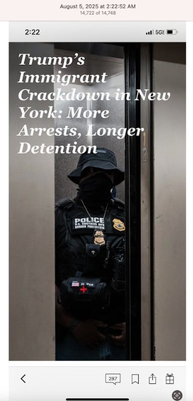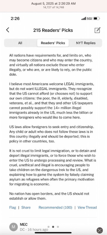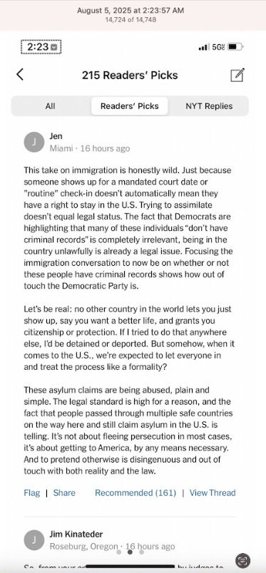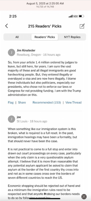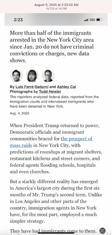 Screenshots above: NYT once again reflecting the criminals' agenda, not the American public's own sentiments. You can see by the very image NYT chose for the article how it's trying to vilify ICE, who many are people of color. Seems the majority of Americans believe in following the law in the pathway to become a citizen, not being here illegally or having open borders for anyone to cross, including fugitives. I'm exposed to migrants every time I step outside my apt door, and they are entitled and hostile in their immediate judgement of ppl and their "white supremacy" delusion. That's while they're on the very land they accuse of being white supremacist and that's supporting them and where they presumably came for a better life.