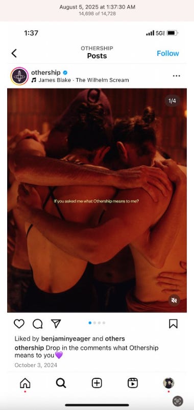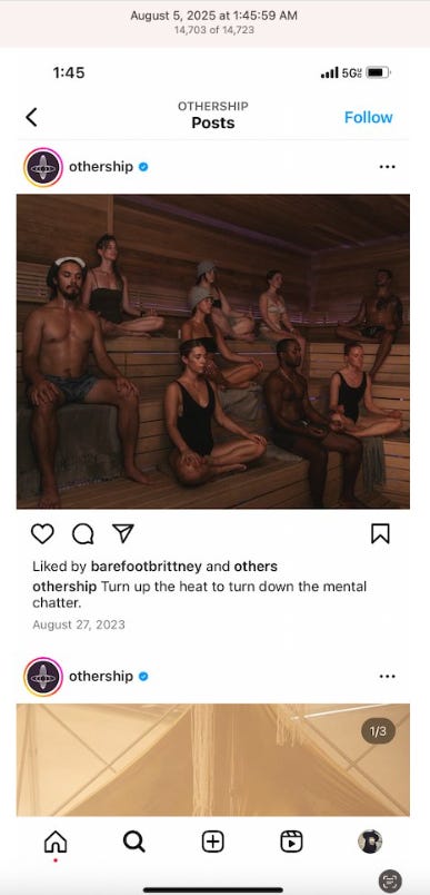 It's called "Othership" but really it's about conformity and conditioning to herd mentality and obedience. It's passing off as new age wellness with guys in man buns, lots of tattoos, quasi meditation and workout culture, but here's why that's bullshit: if it were genuinely about meditation and all that, it wouldn't need the sex appeal that it relies on to sell its service. Half naked bodies and DJ's in the sauna wouldn't be necessary. It also wouldn’t harp so much on the group, but the individual because medication and spirituality is personal, something a person can do on her own. Cults are groups. It's all just an excuse to charge a hefty price to use the sauna then dip in a bathtub that many others have used, probably pissed in.