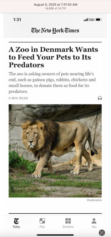 Screenshot above: Not an accident a lion should be the image for the article. It has zero artistic merit and looks like it came from a zoology textbook. NYT used to have beautiful photojournalism done tastefully, intriguingly that inspired thoughtfulness and wonder. Now it's textbook tedious.