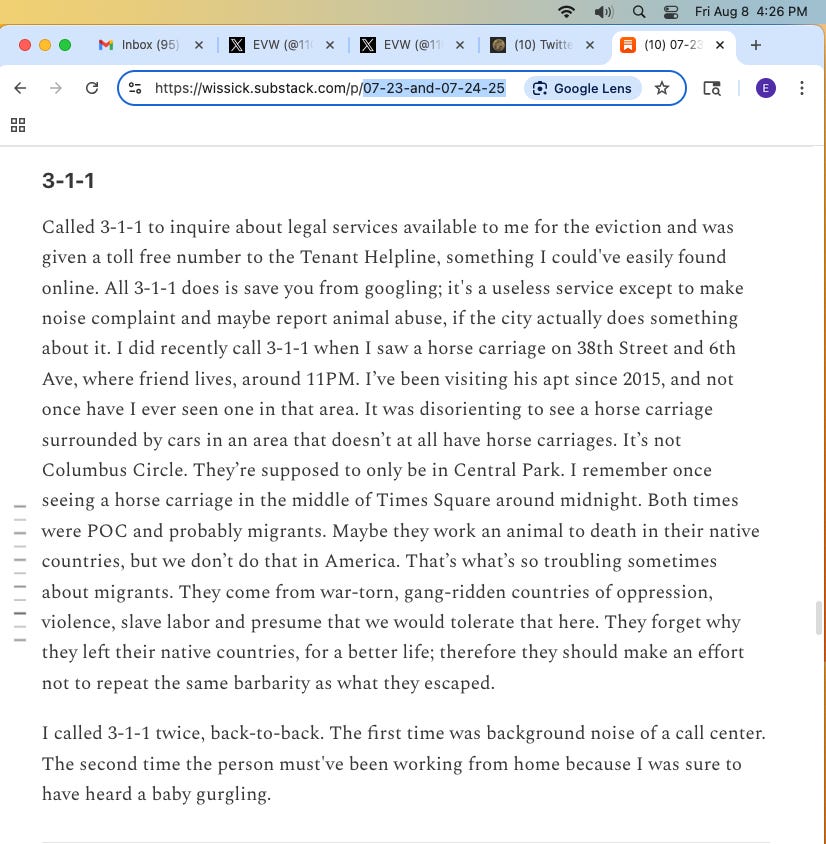 Screenshot above: Coincidentally, I had called 3-1-1 to report a carnage horse seen on 38th Street and 6th Avenue on July 23rd.
