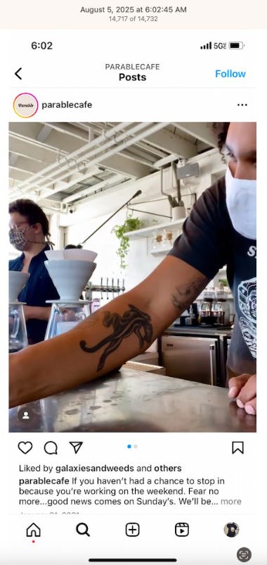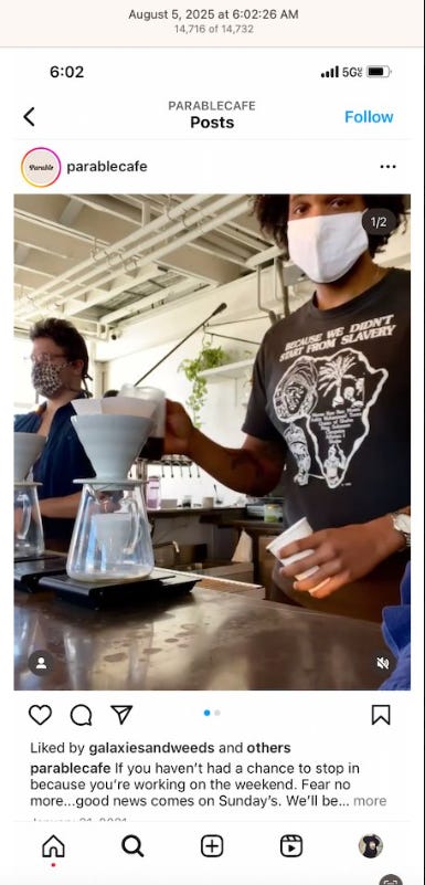 Screenshots above: Person from Parable Coffee is wearing a shirt that reads, Because We Didn't Start From Slavery.